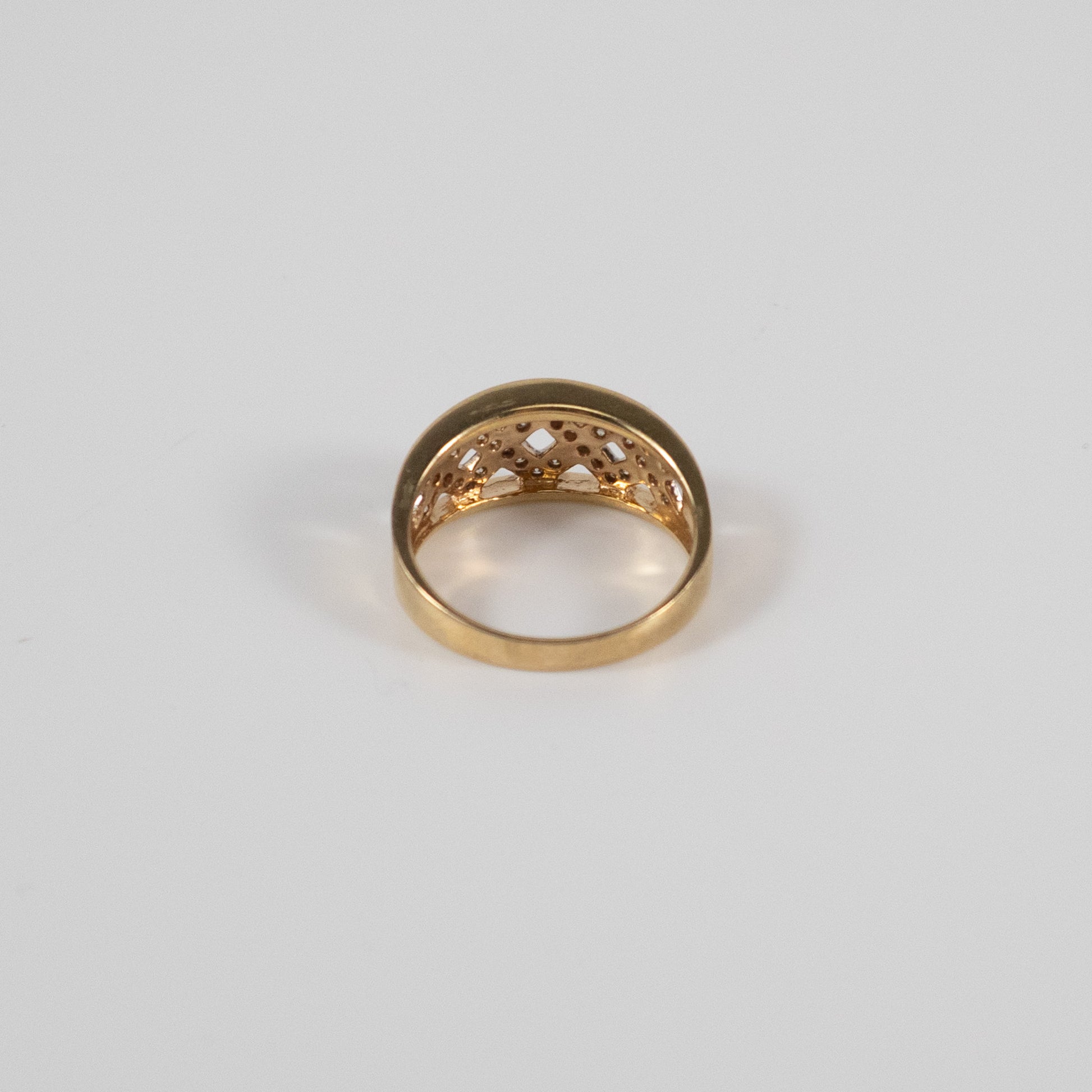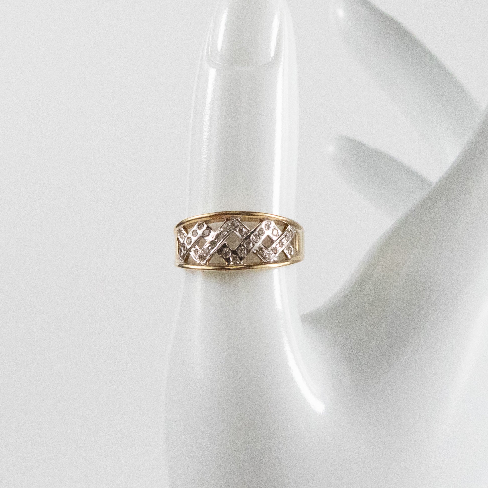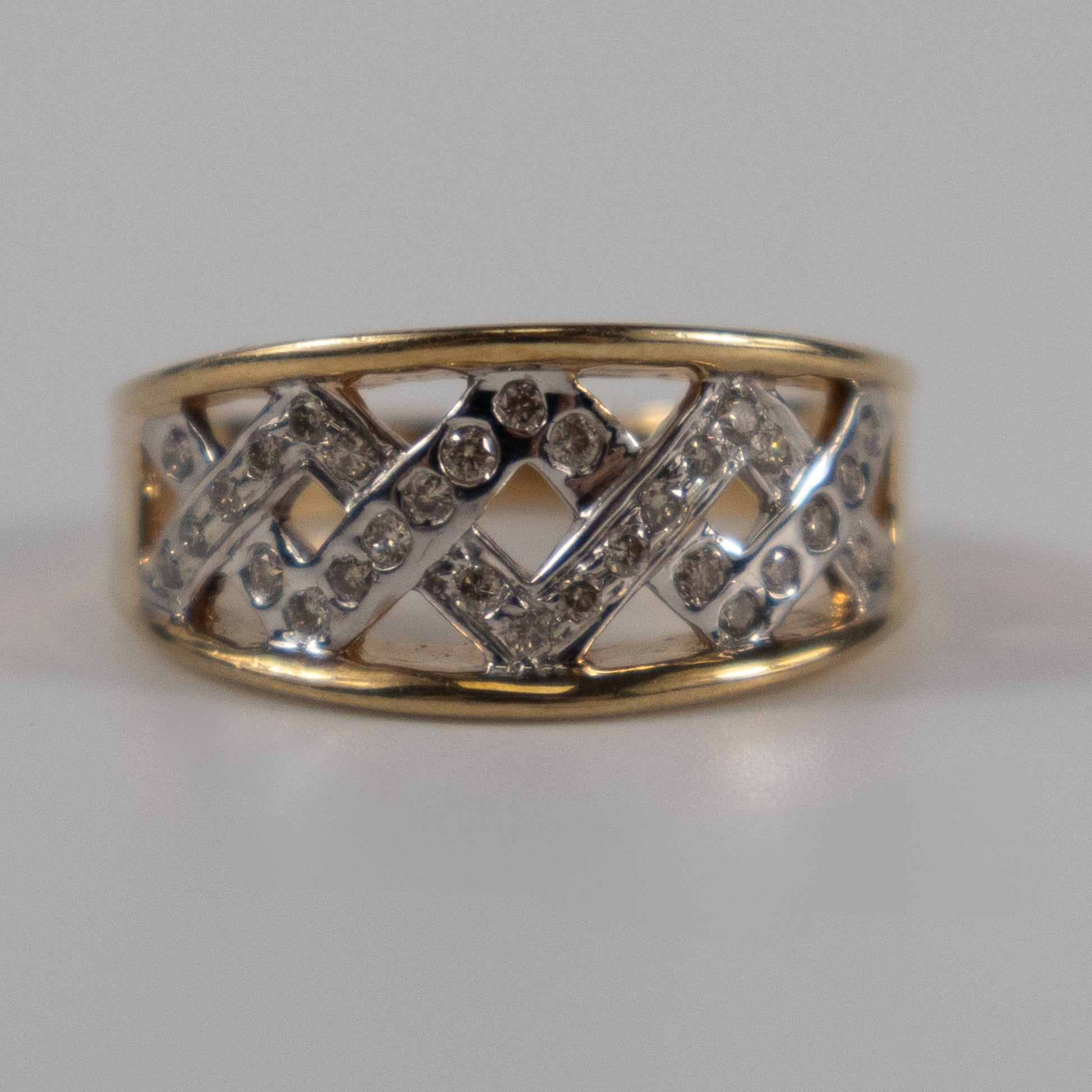 A second-hand 9ct gold band ring featuring a distinctive lattice-style cut-out design, set with a total of 0.24 carats of round-cut diamonds. The openwork pattern is finished with white gold detailing that enhances the sparkle of each stone. This is a solid and eye-catching piece, ideal for everyday wear or as a statement ring. Fully hallmarked for 9ct gold and stamped with the diamond weight.