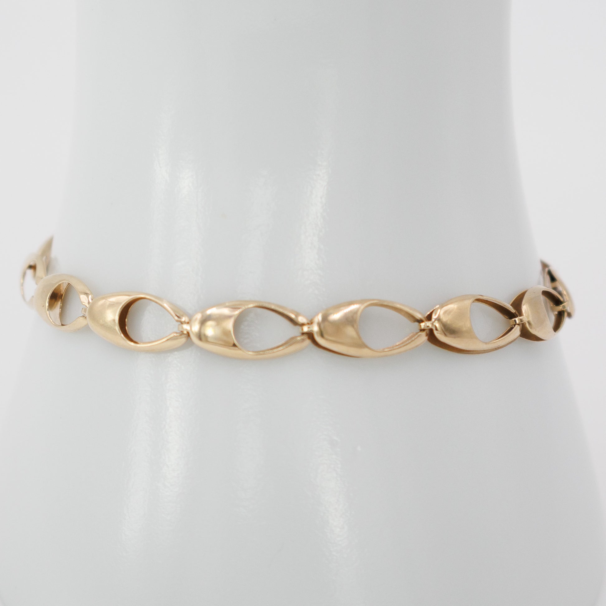 This second-hand 9ct gold bracelet features a series of bold oval links, giving it a distinctive style that stands out on the wrist. Fully authenticated and crafted in 9ct gold, it is in very good pre-owned condition, showing only light wear consistent with careful use. A versatile piece that can be worn every day or saved for special occasions, it’s a timeless addition to any jewellery collection.