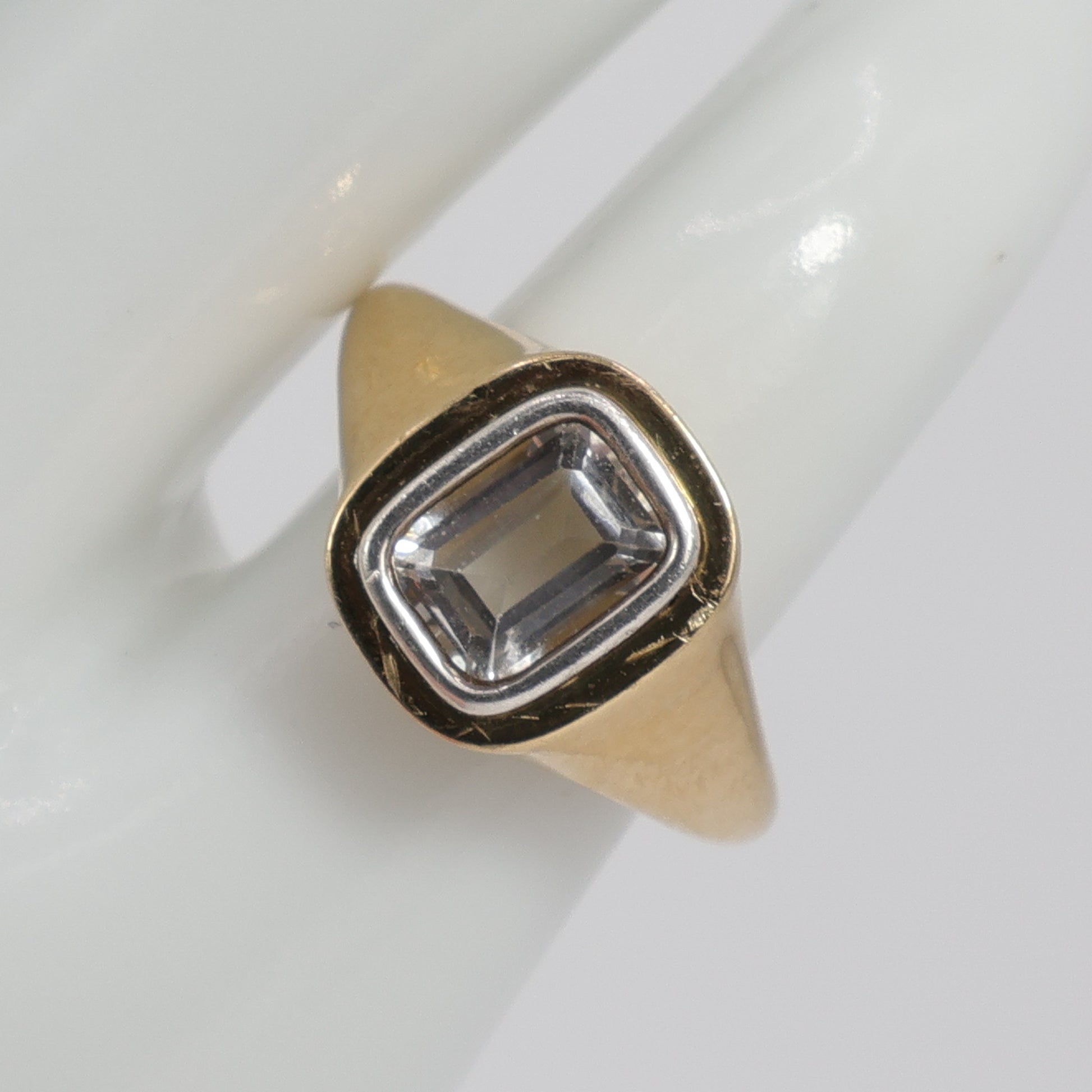 This second-hand 9ct gold signet-style ring is set with a rectangular clear stone in a secure bezel setting. The clean lines and bold design give it a classic look, while the polished gold band provides a smooth finish. Fully authenticated and in good pre-owned condition, the ring shows light wear consistent with age and previous use. A versatile piece that can be worn every day or reserved for special occasions.