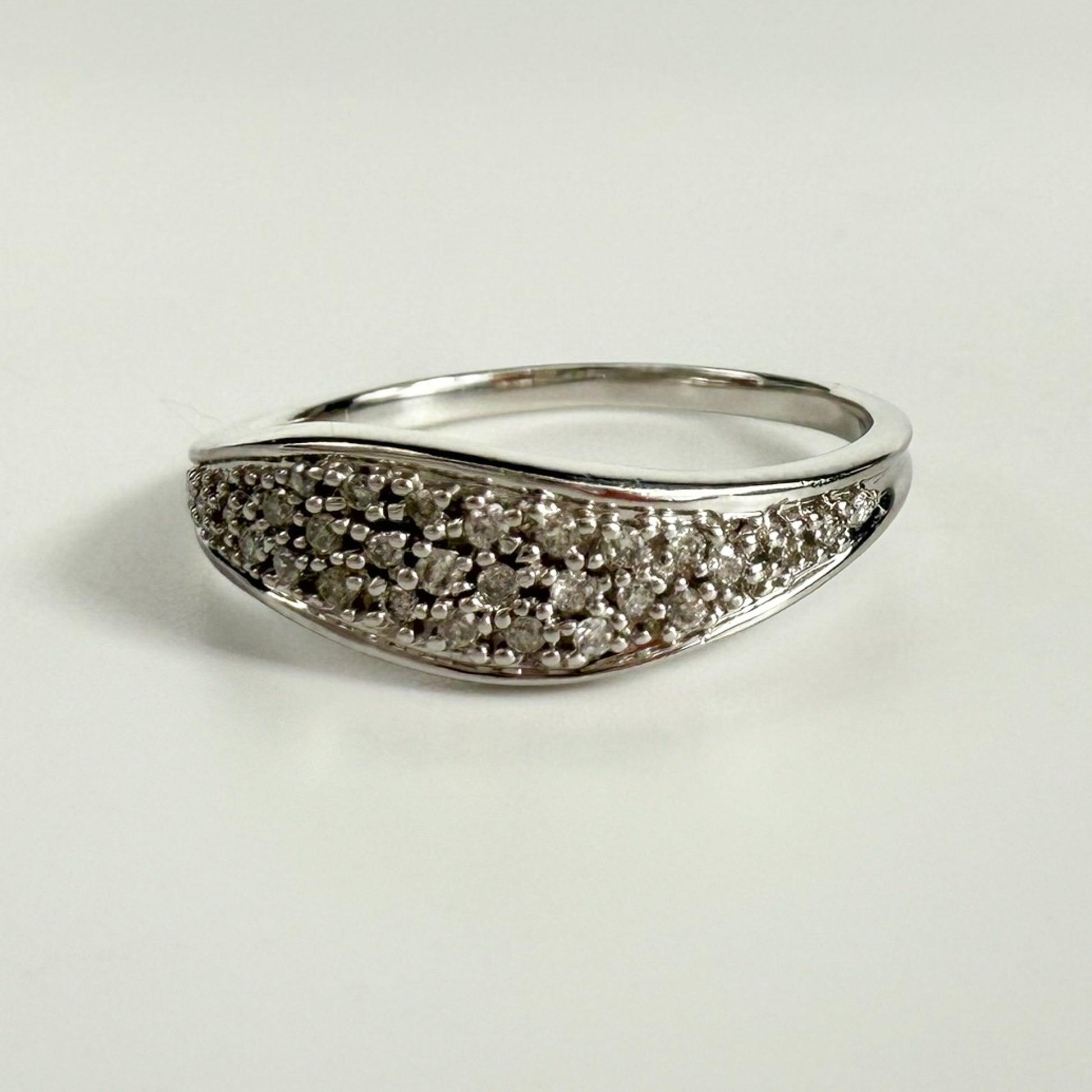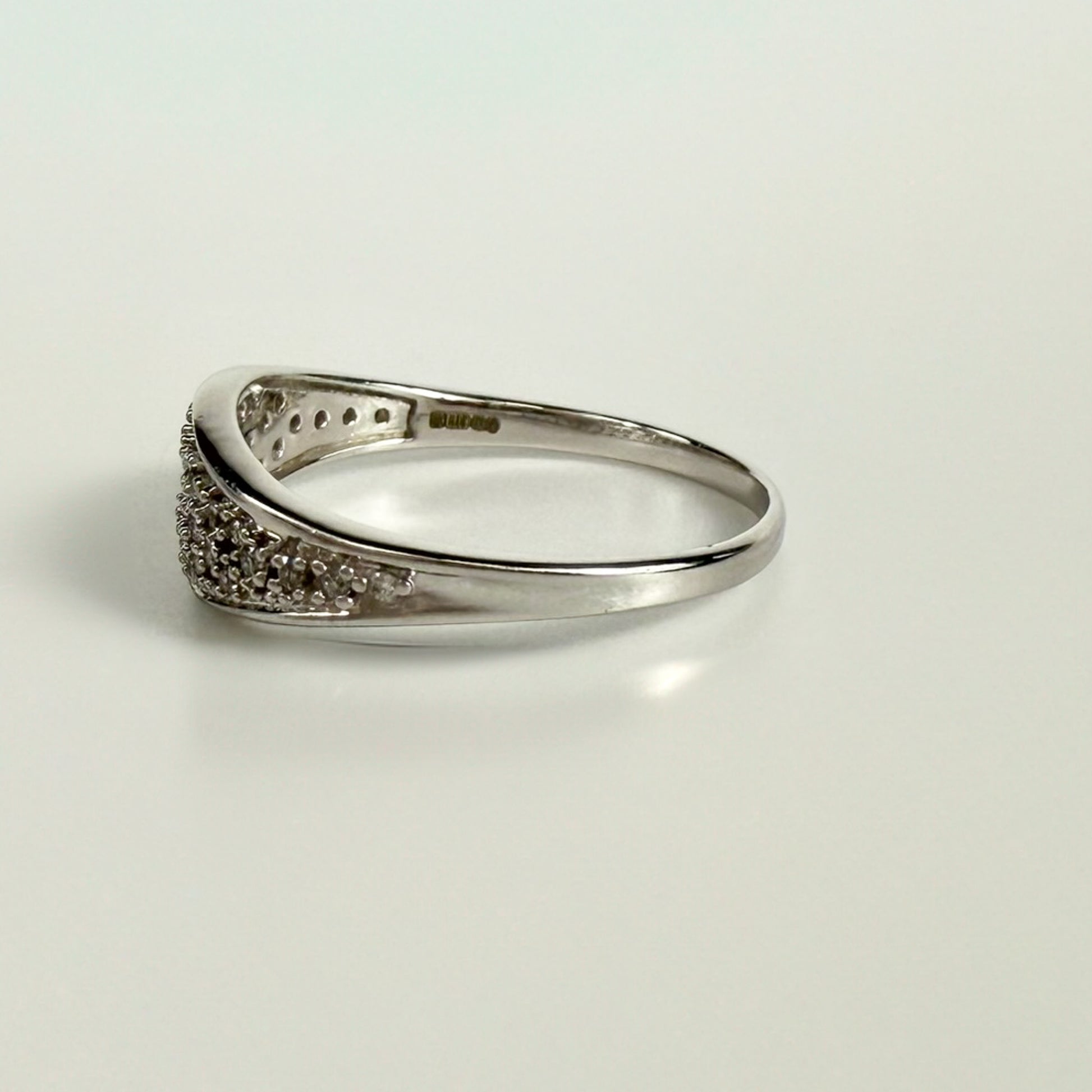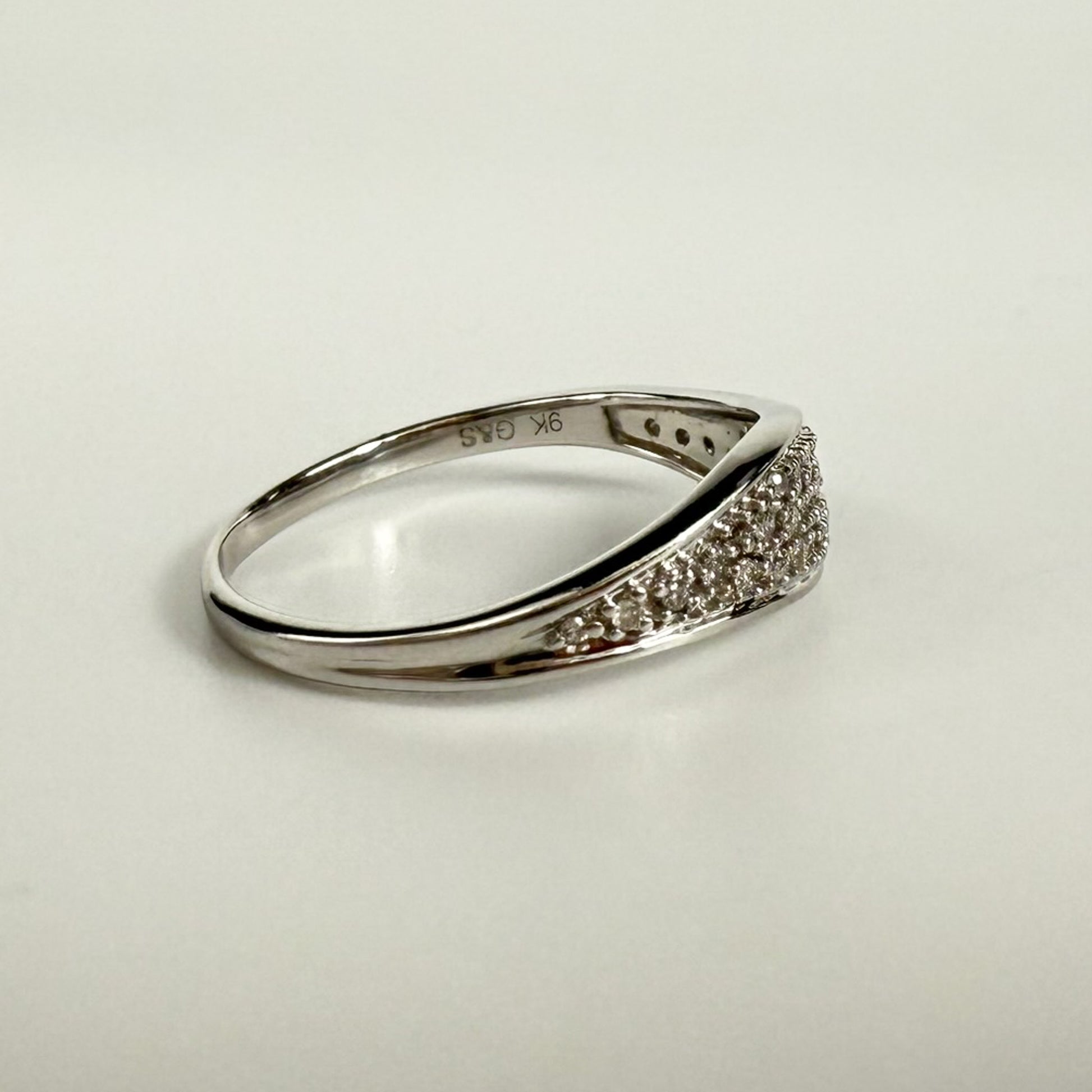 This second-hand 9ct white gold ring features an asymmetric band set with a cluster of round-cut natural diamonds. The gentle curve of the setting adds a soft modern touch to a classic shape, giving it a distinctive yet wearable style. Hallmarked for 9ct gold and in very good pre-owned condition with minimal signs of wear.
