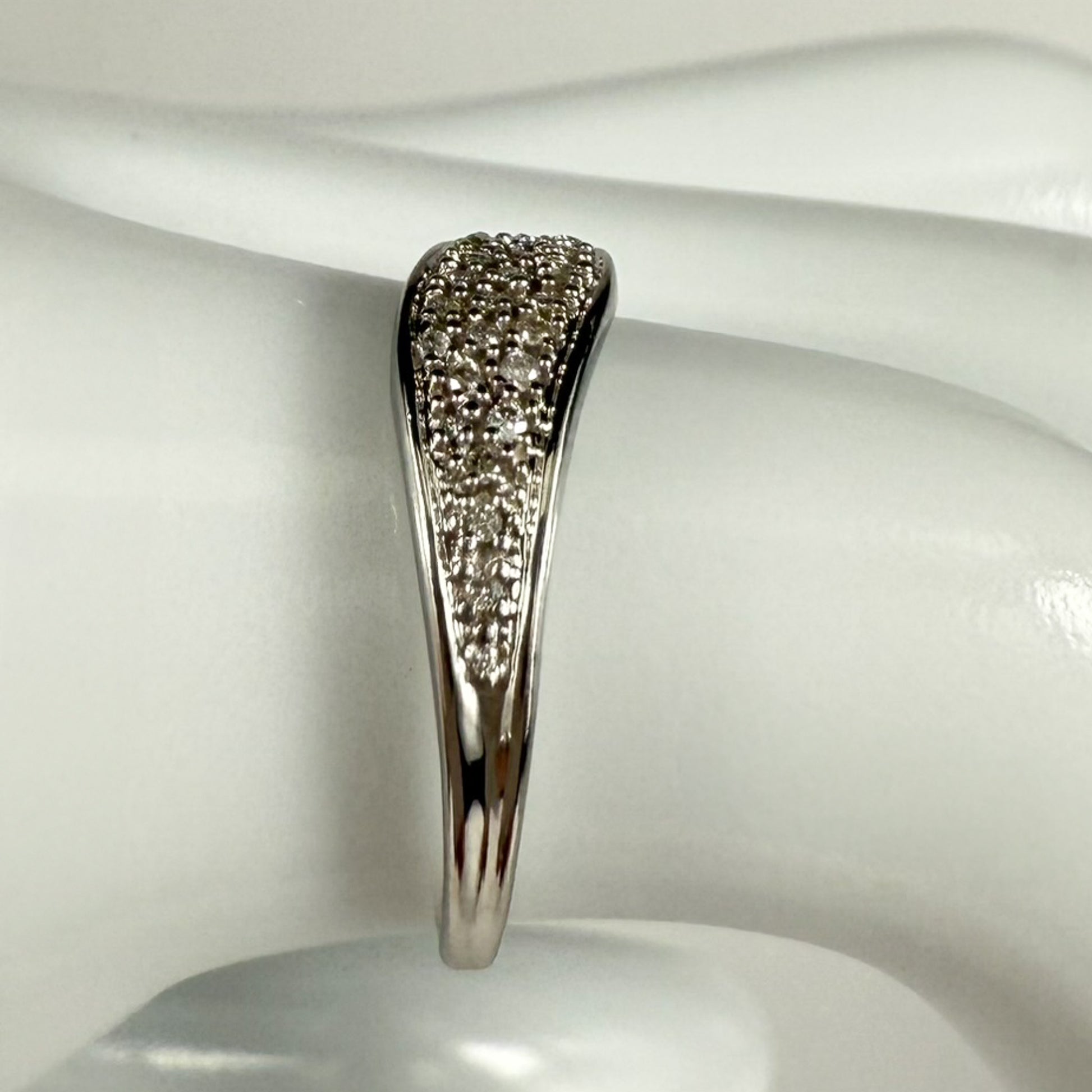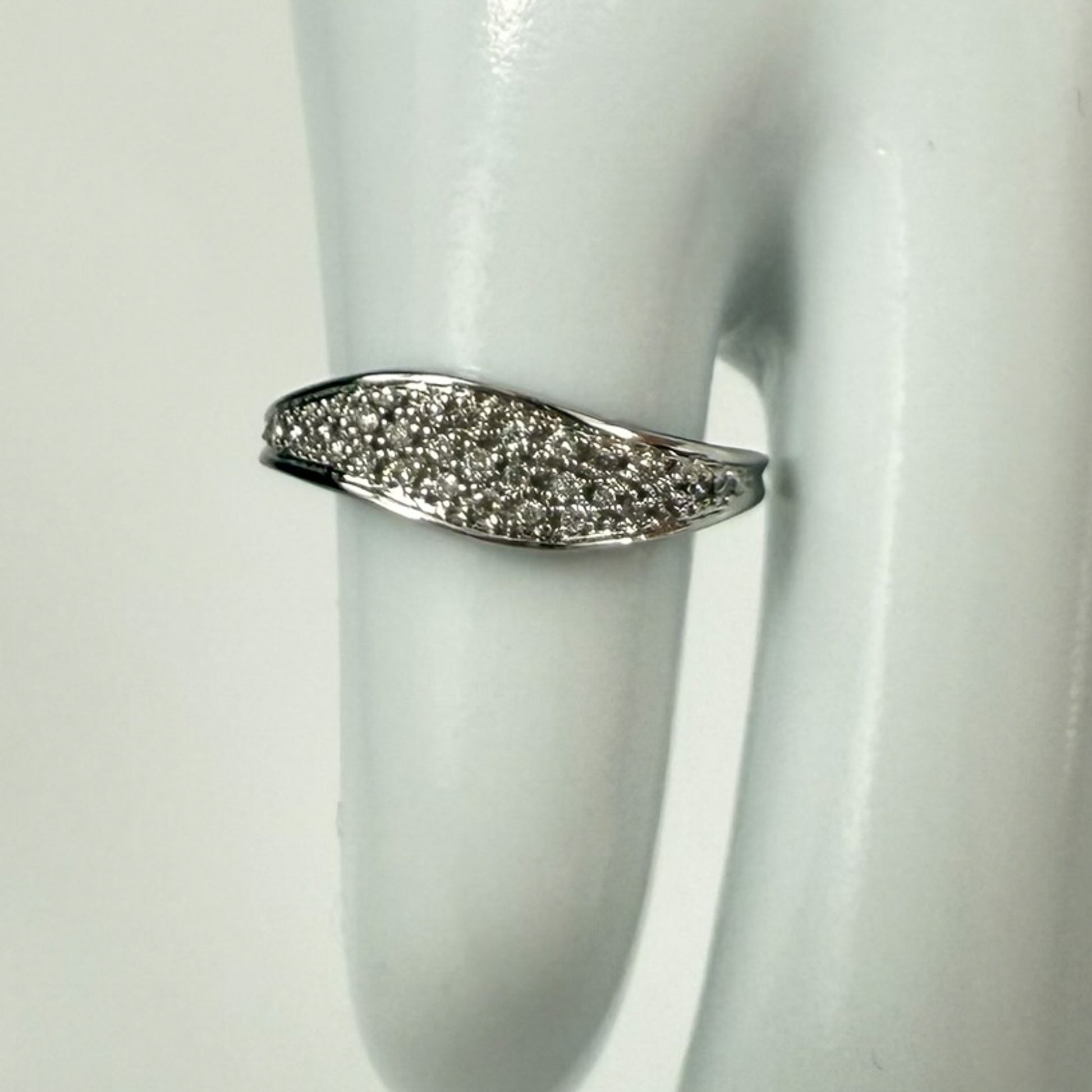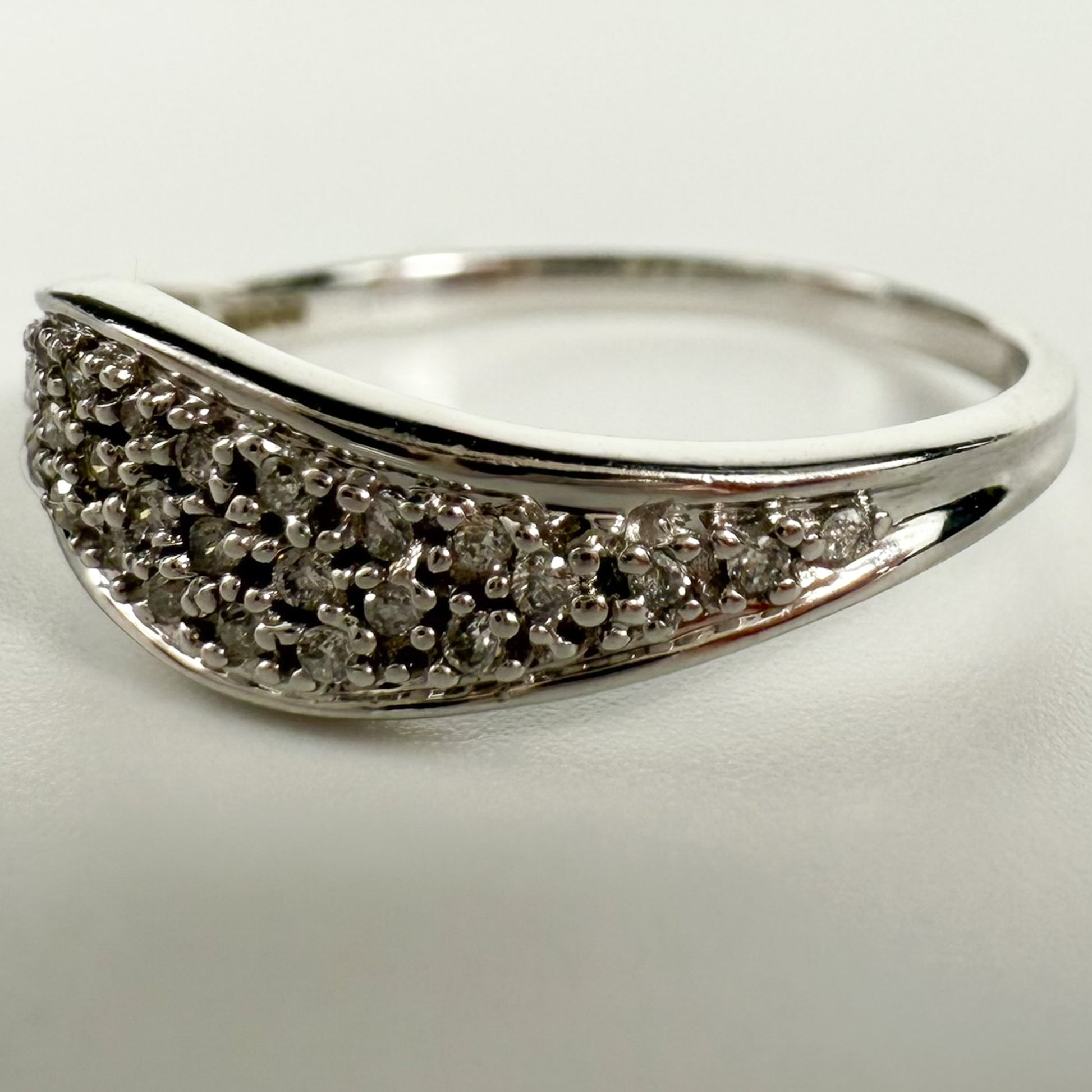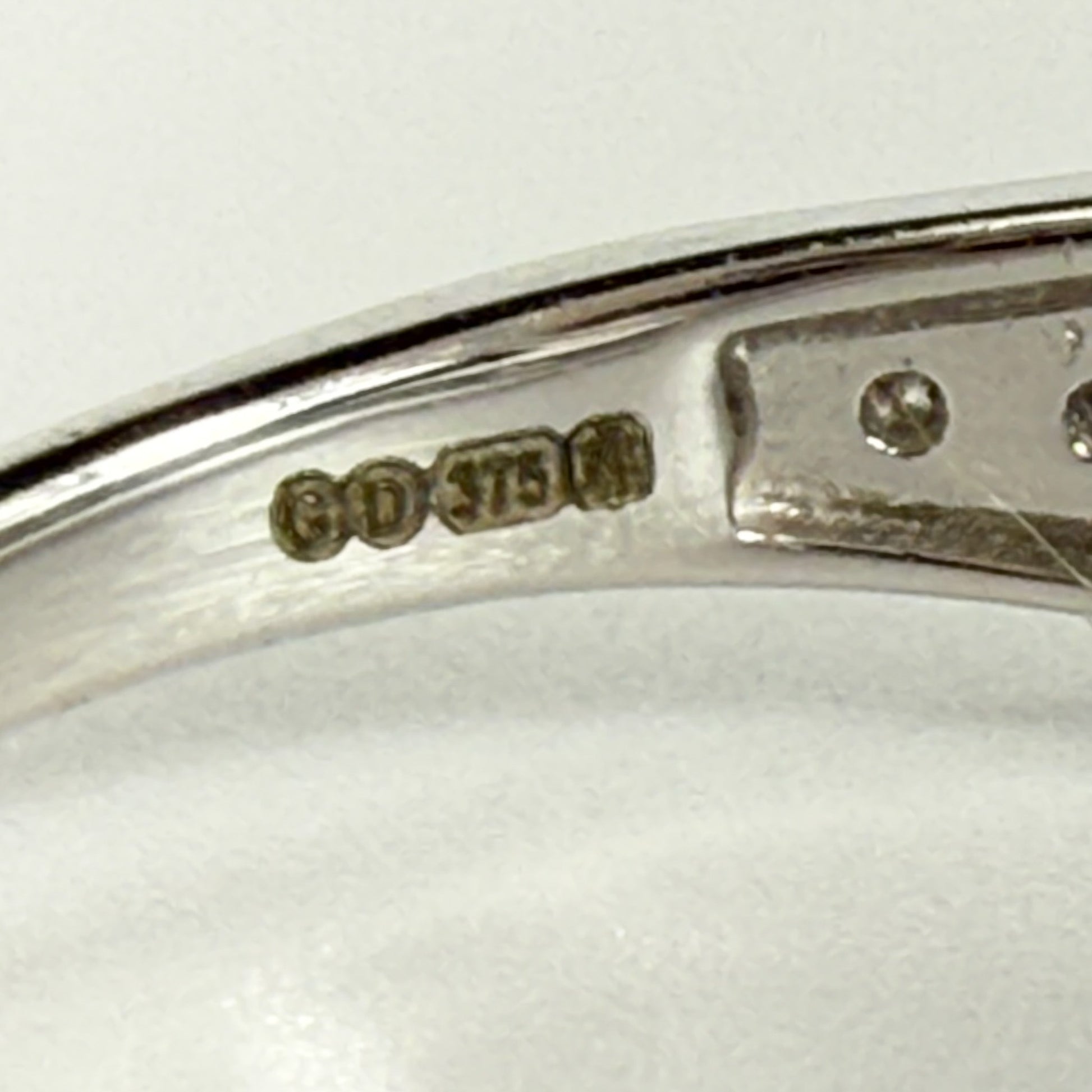 This second-hand 9ct white gold ring features an asymmetric band set with a cluster of round-cut natural diamonds. The gentle curve of the setting adds a soft modern touch to a classic shape, giving it a distinctive yet wearable style. Hallmarked for 9ct gold and in very good pre-owned condition with minimal signs of wear.