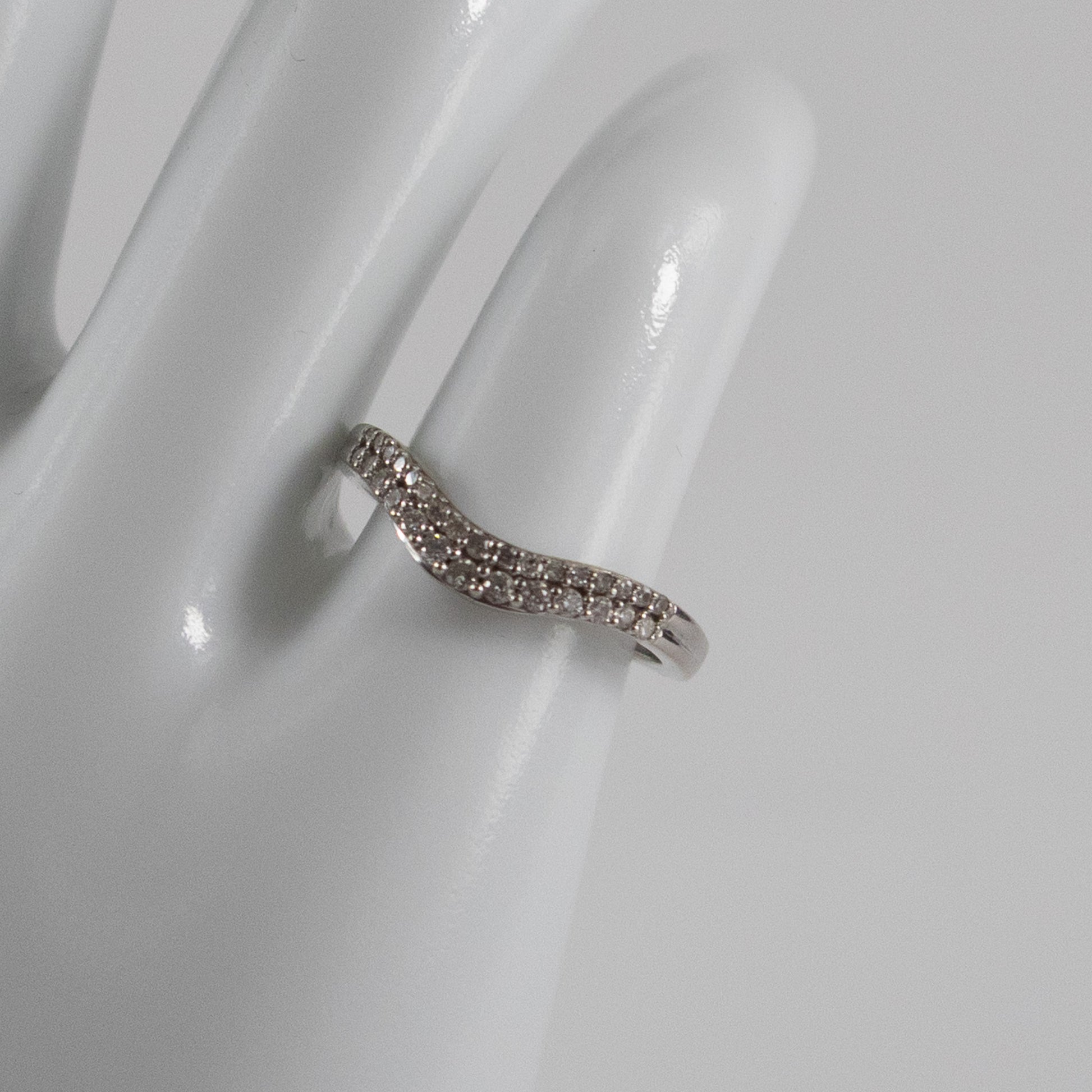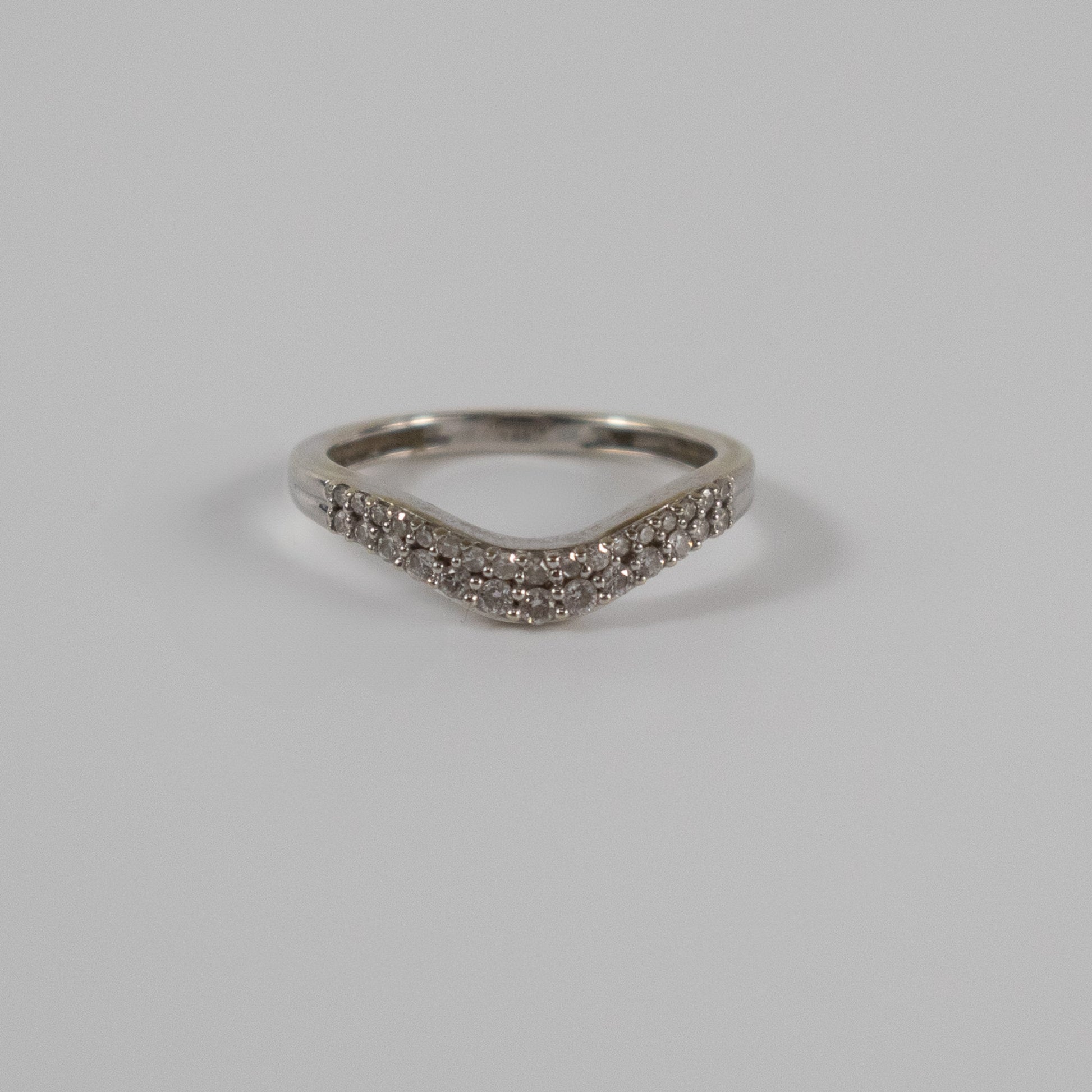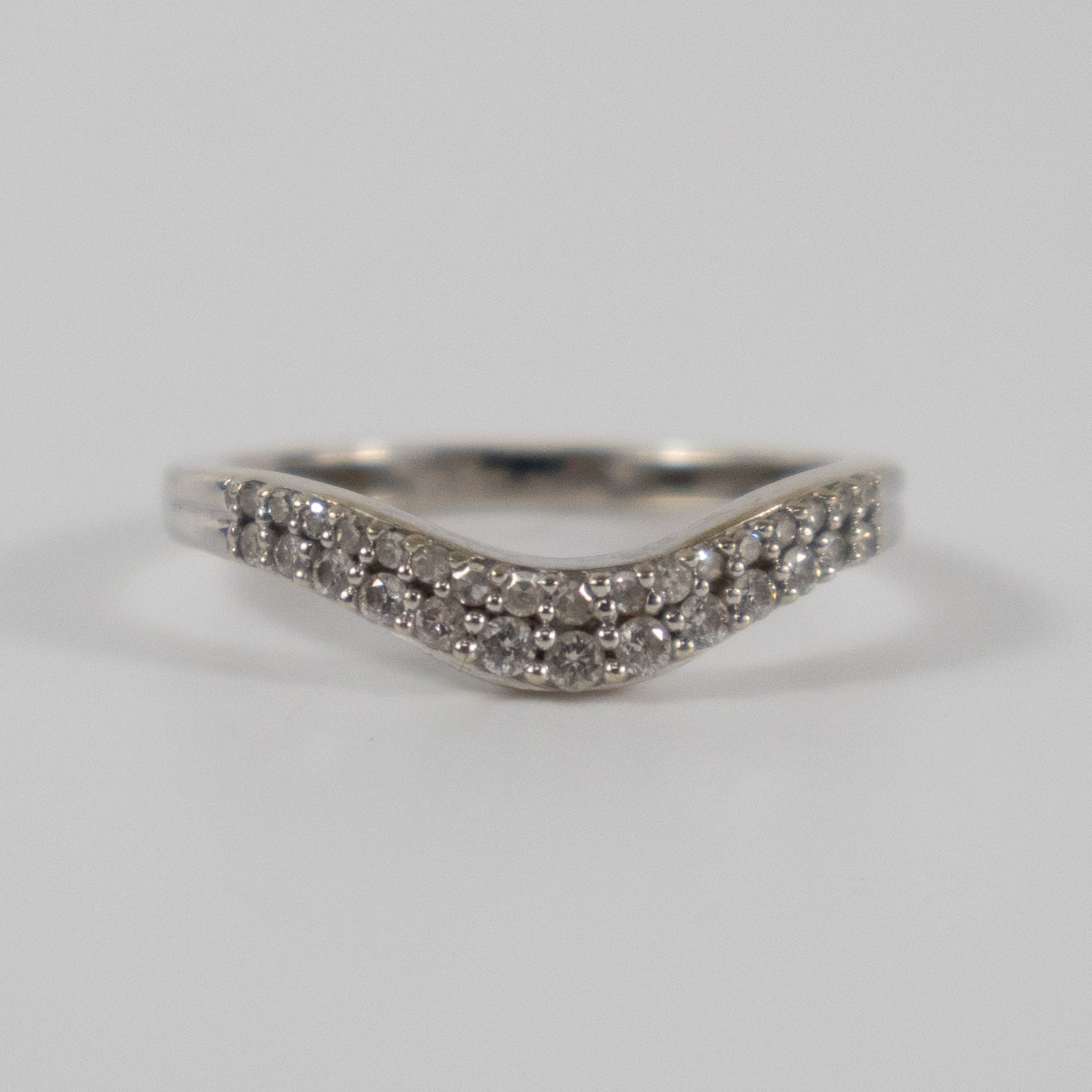 A pre-owned 9ct white gold wishbone ring set with two neat rows of round-cut diamonds. The gentle V-shape is designed to sit perfectly alongside a solitaire or cluster engagement ring, creating a seamless fit. This elegant piece is in very good second-hand condition with all stones securely set. A timeless choice for stacking, pairing, or wearing on its own. Hallmarked for 9ct gold.