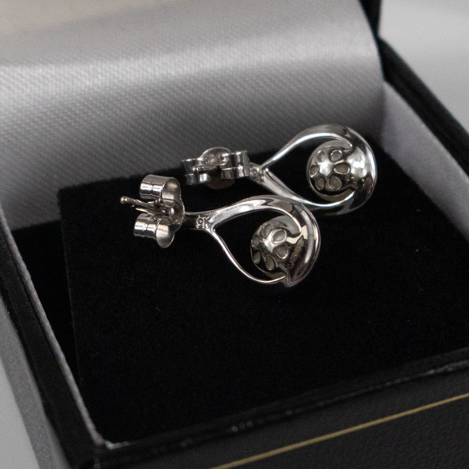 An elegant pair of second-hand 9ct white gold stud earrings, each set with a luminous round pearl held within a graceful swirl design. The sweeping curves are lined with sparkling cubic zirconia, adding a refined touch of sparkle. Perfect for both day and evening wear, these earrings are secured with butterfly backs for a comfortable fit. Professionally cleaned, authenticated, and ready to be worn again.