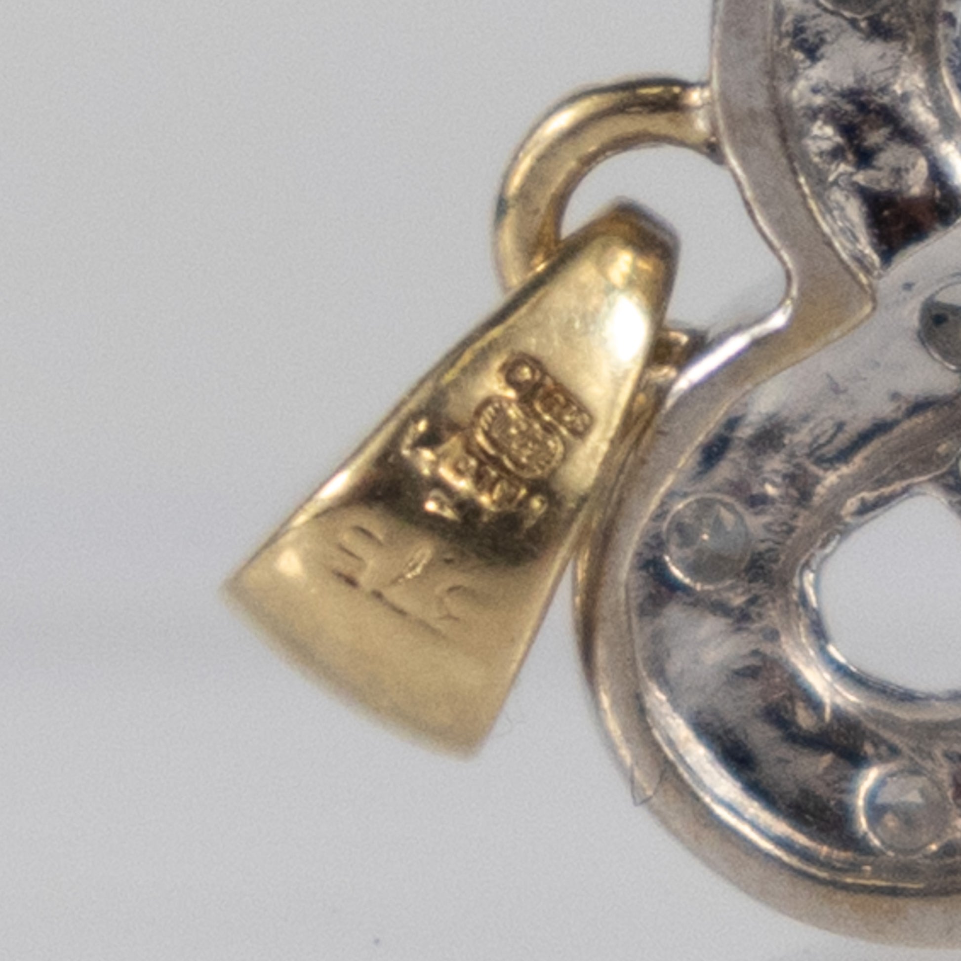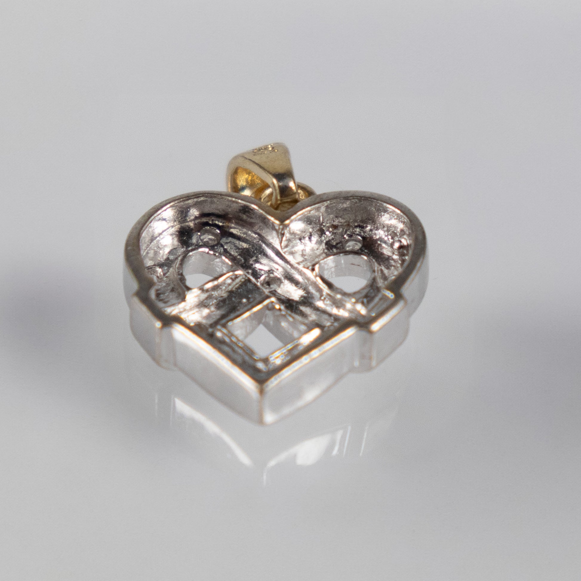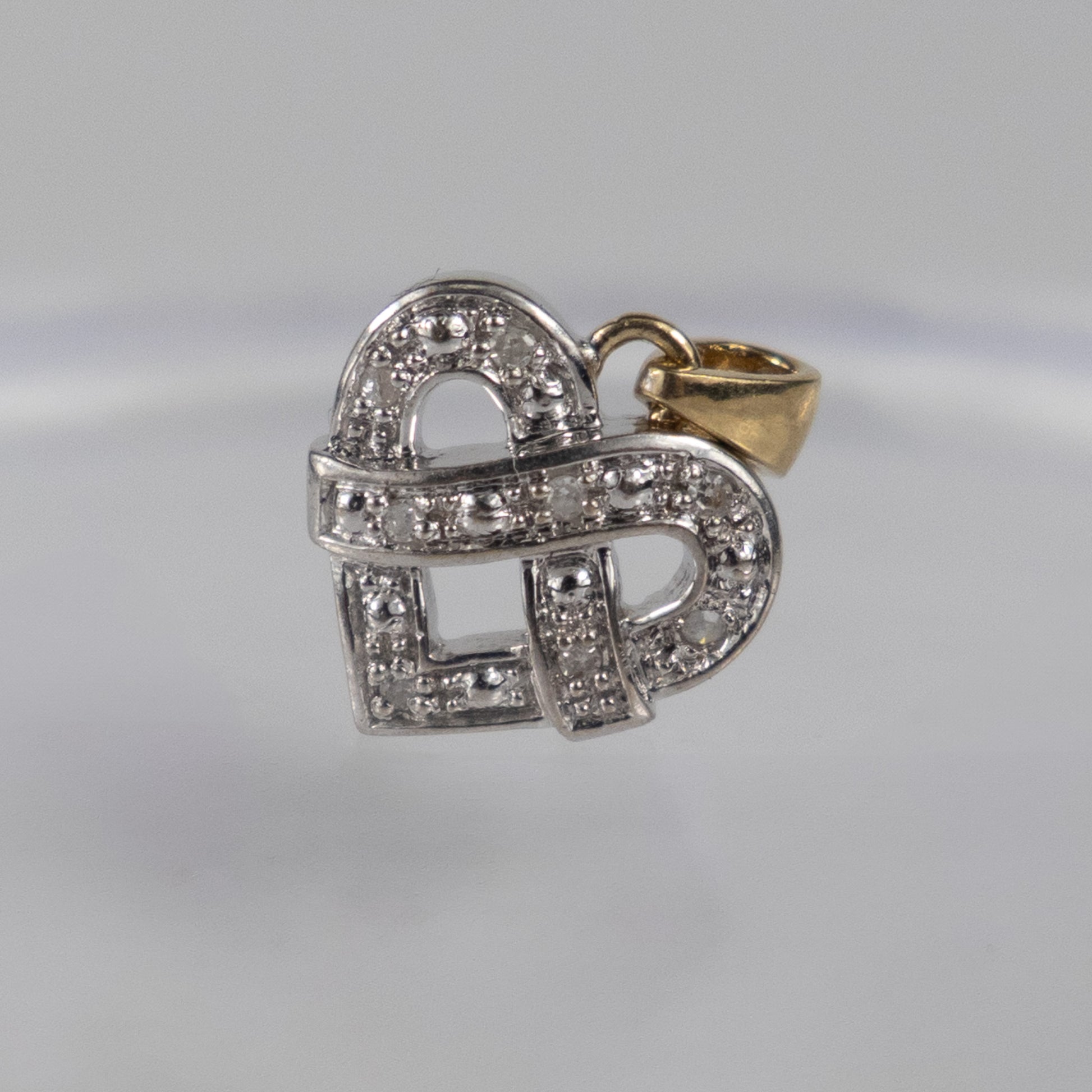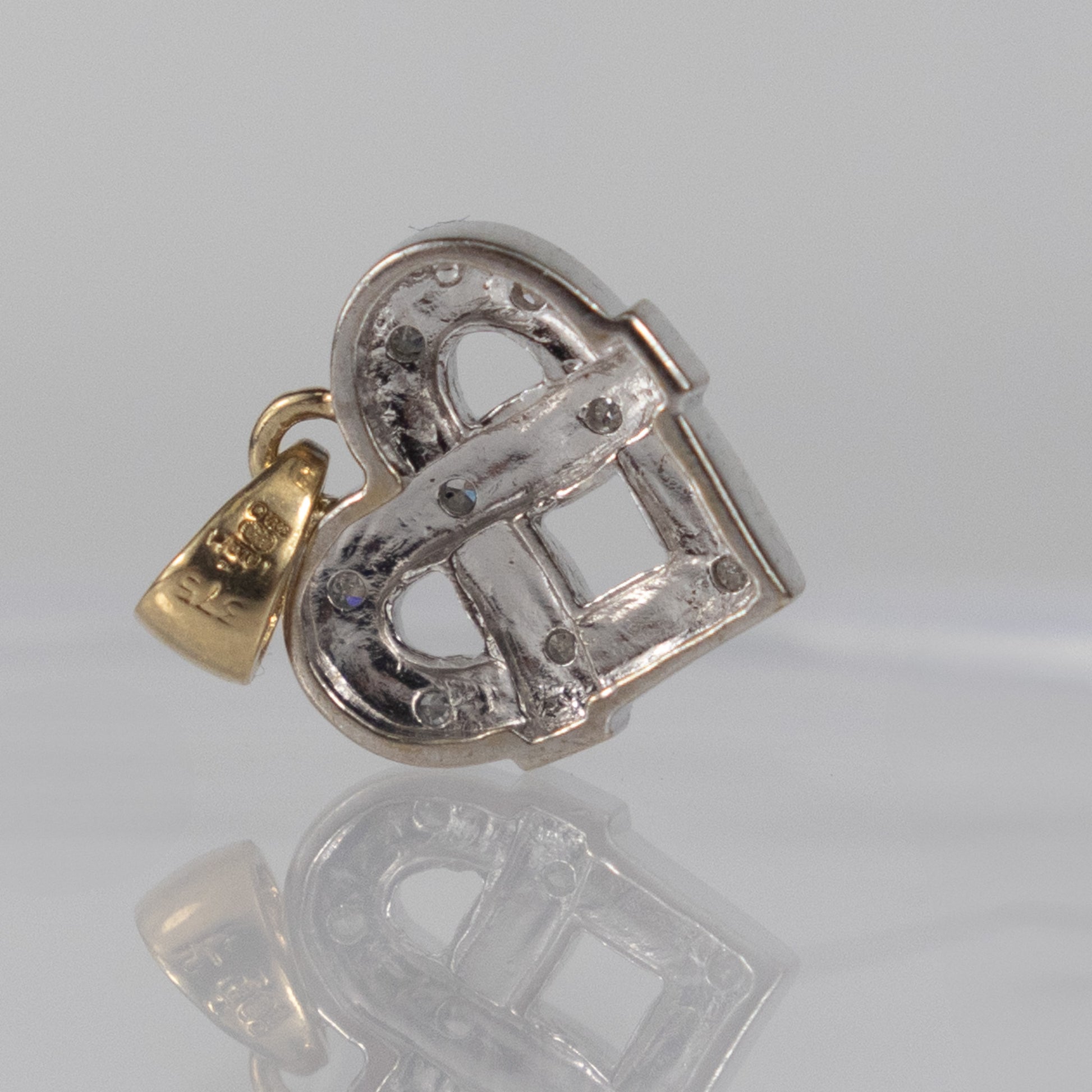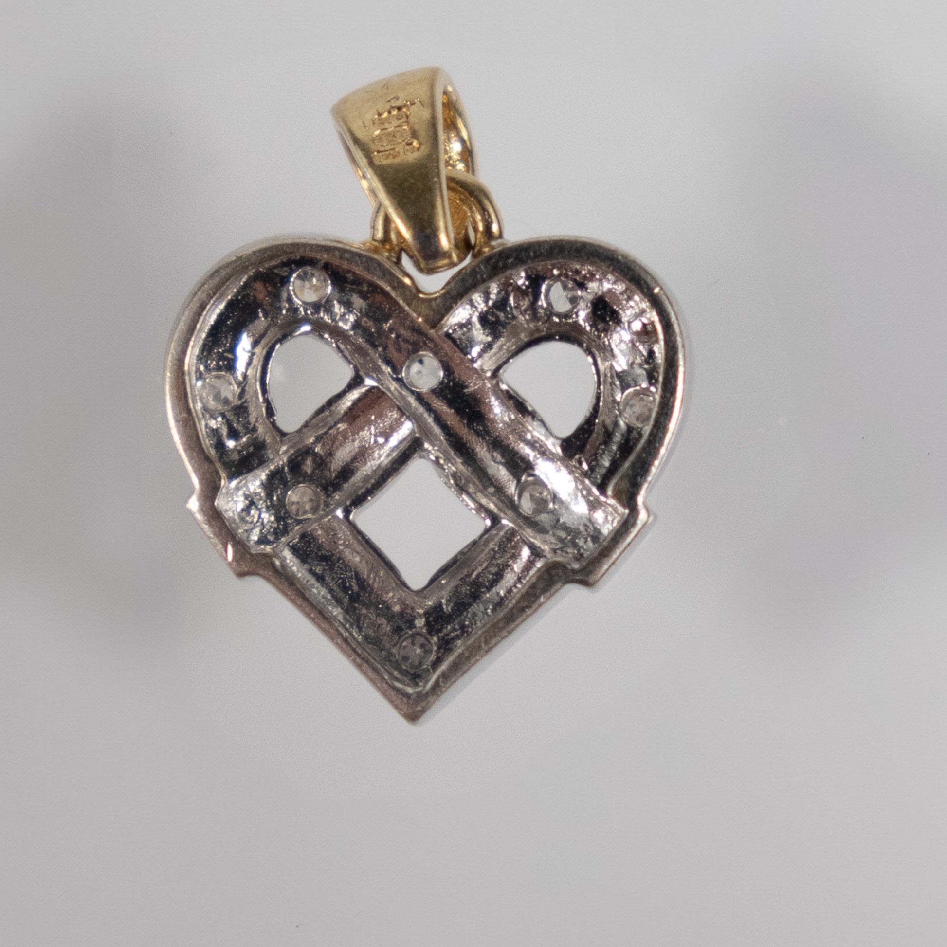 This second-hand 9ct gold heart pendant features a striking white gold overlay set with small diamonds, creating a crossover knot design. A symbol of love and connection, it’s ideal for everyday wear or as a meaningful gift. The pendant is fully hallmarked and in very good condition, with a polished finish and secure loop for your own chain.