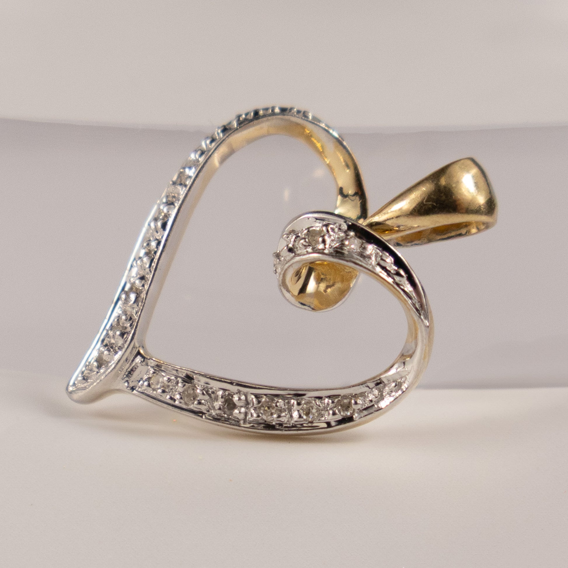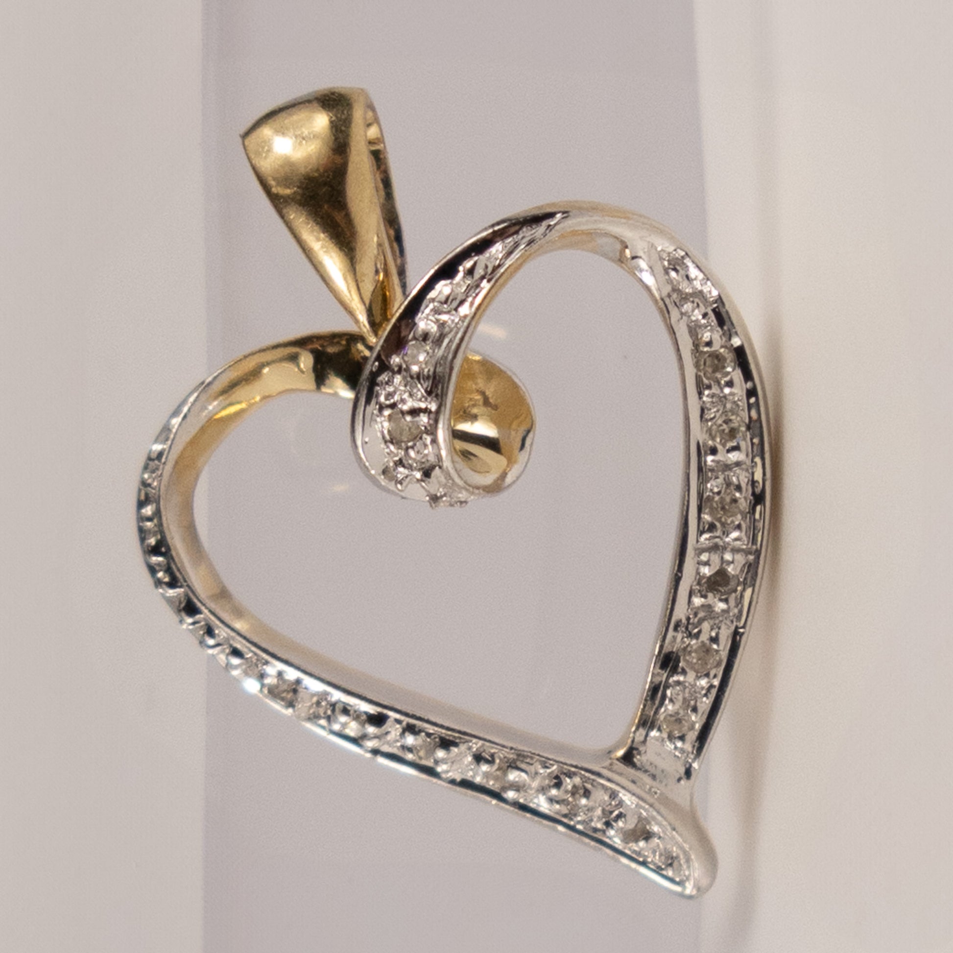 This second-hand 9ct gold heart pendant features an elegant swirl design, partly wrapped in white gold and set with round diamonds for a soft sparkle. The open-heart shape keeps it light and modern, while the gentle curves give it a romantic touch. Fully hallmarked and in very good condition.