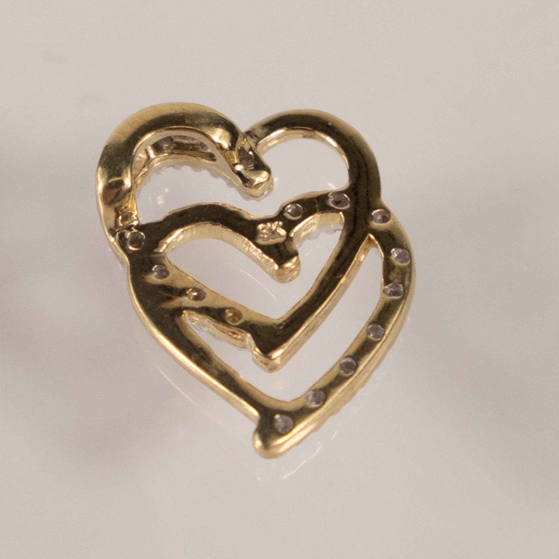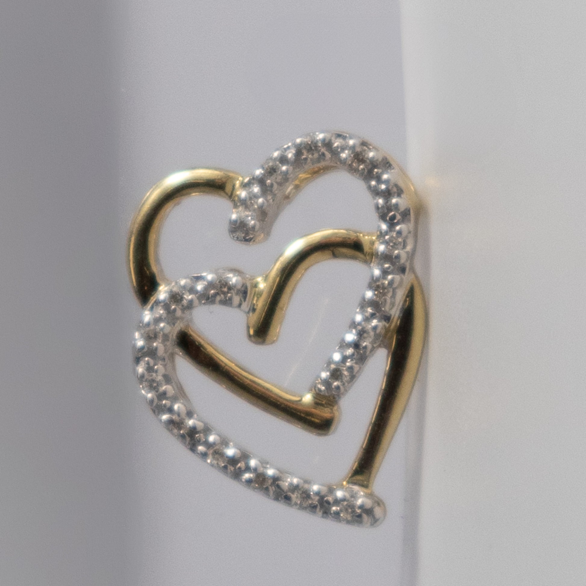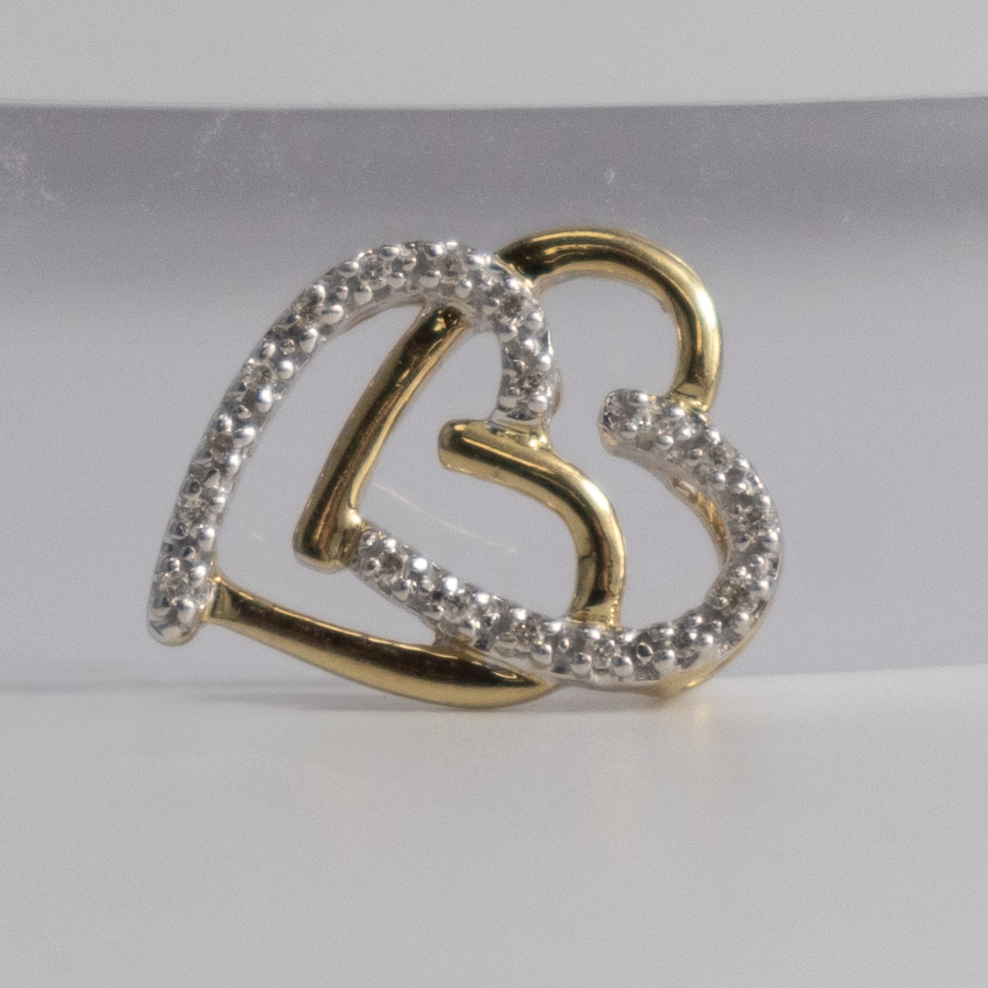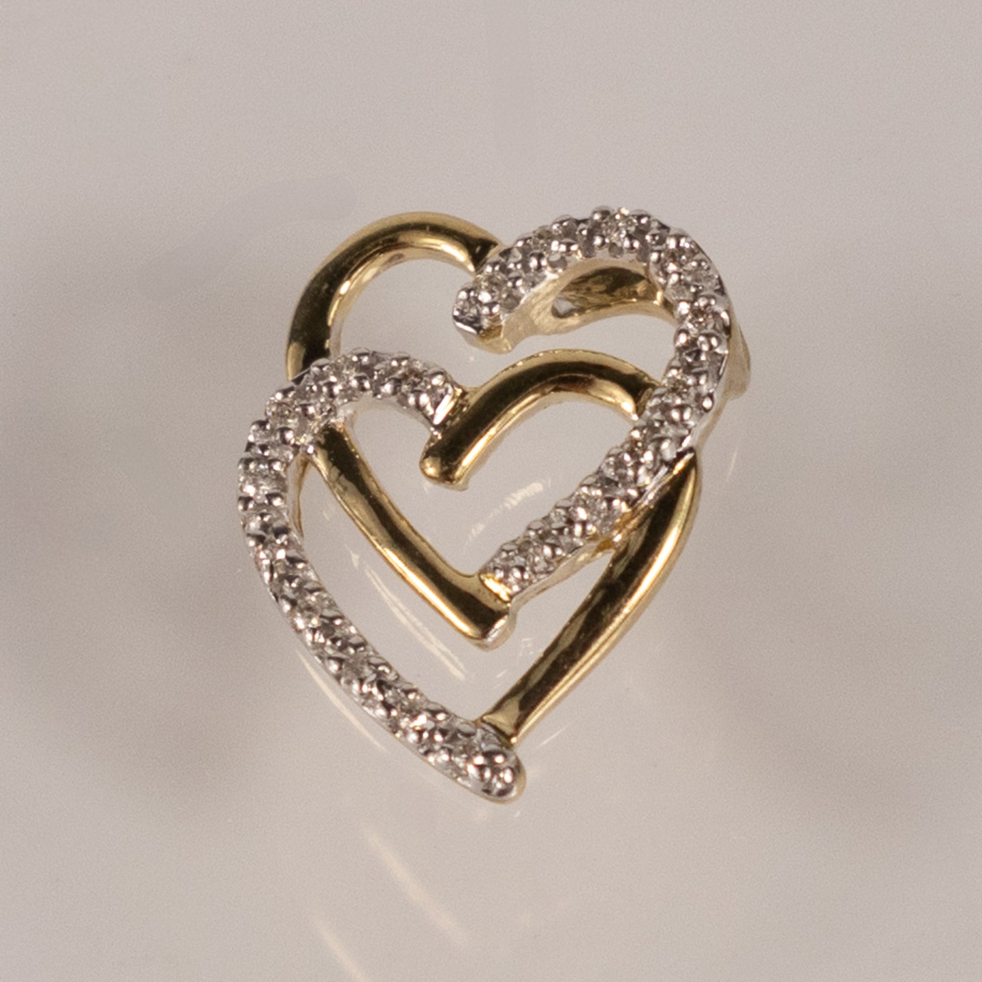 A charming second-hand pendant crafted in 9ct yellow gold, featuring two open hearts intertwined. In very good condition and fully hallmarked.