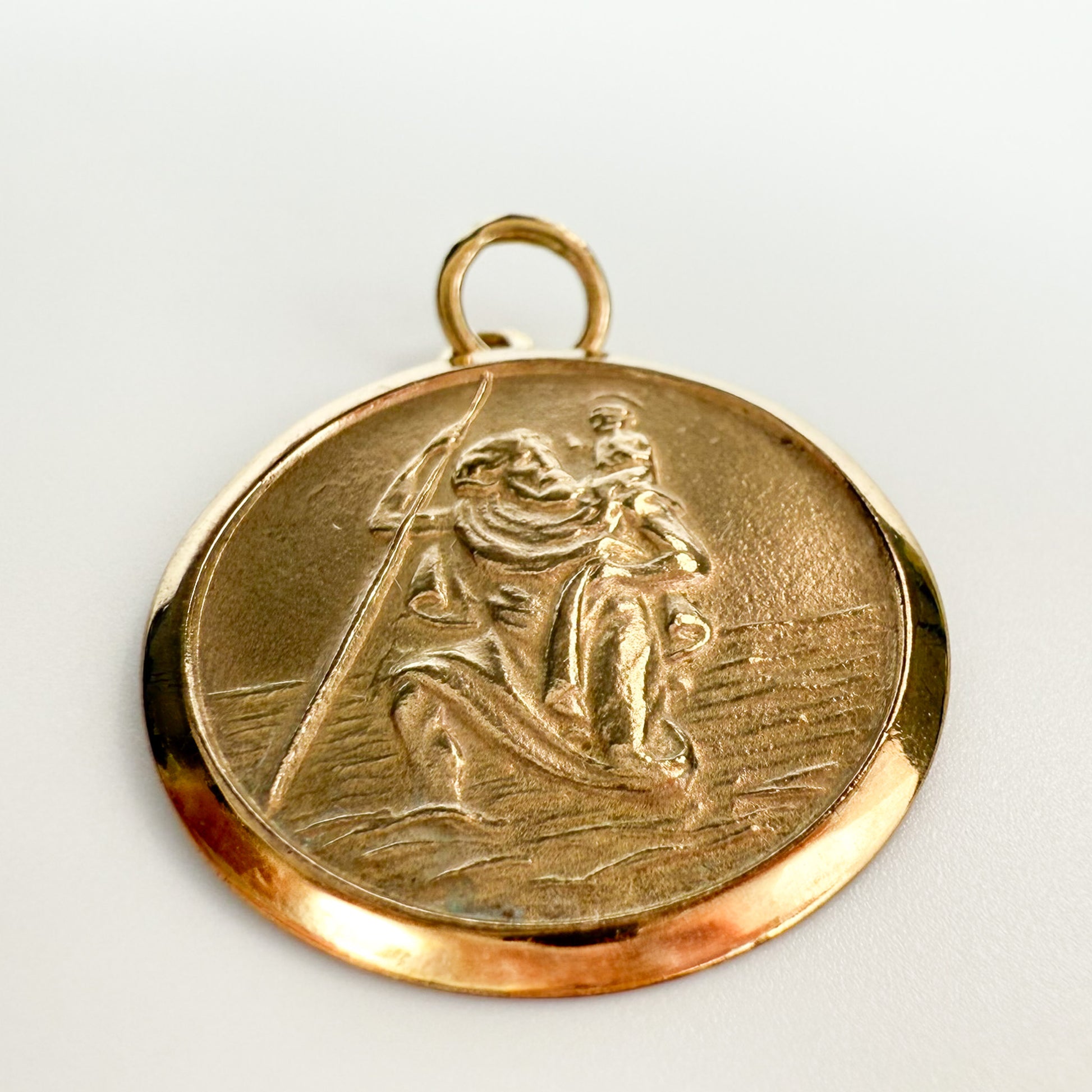 This 9ct gold pendant features St. Christopher carrying the Christ child. The design is embossed with a polished outer edge and a loop at the top for a chain.