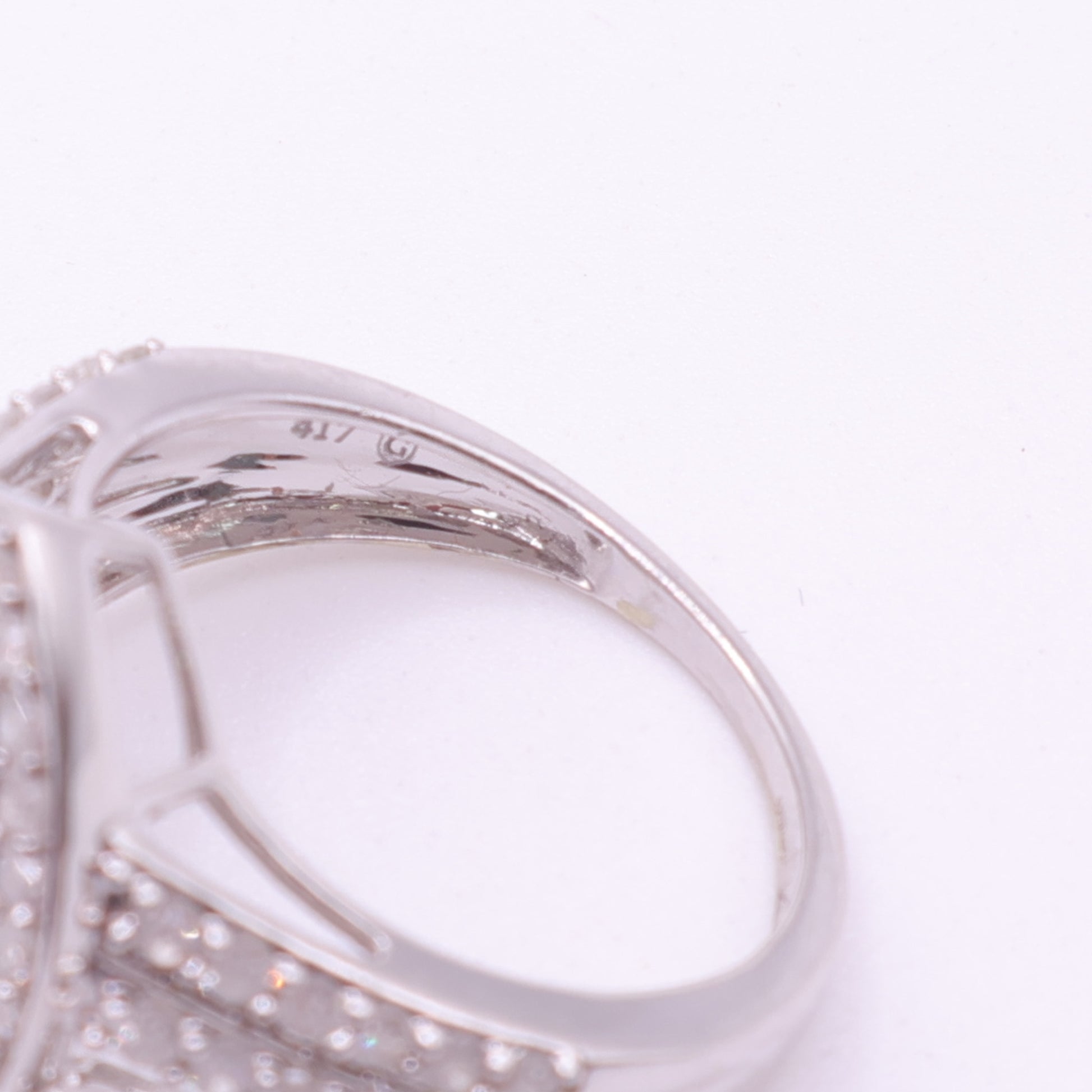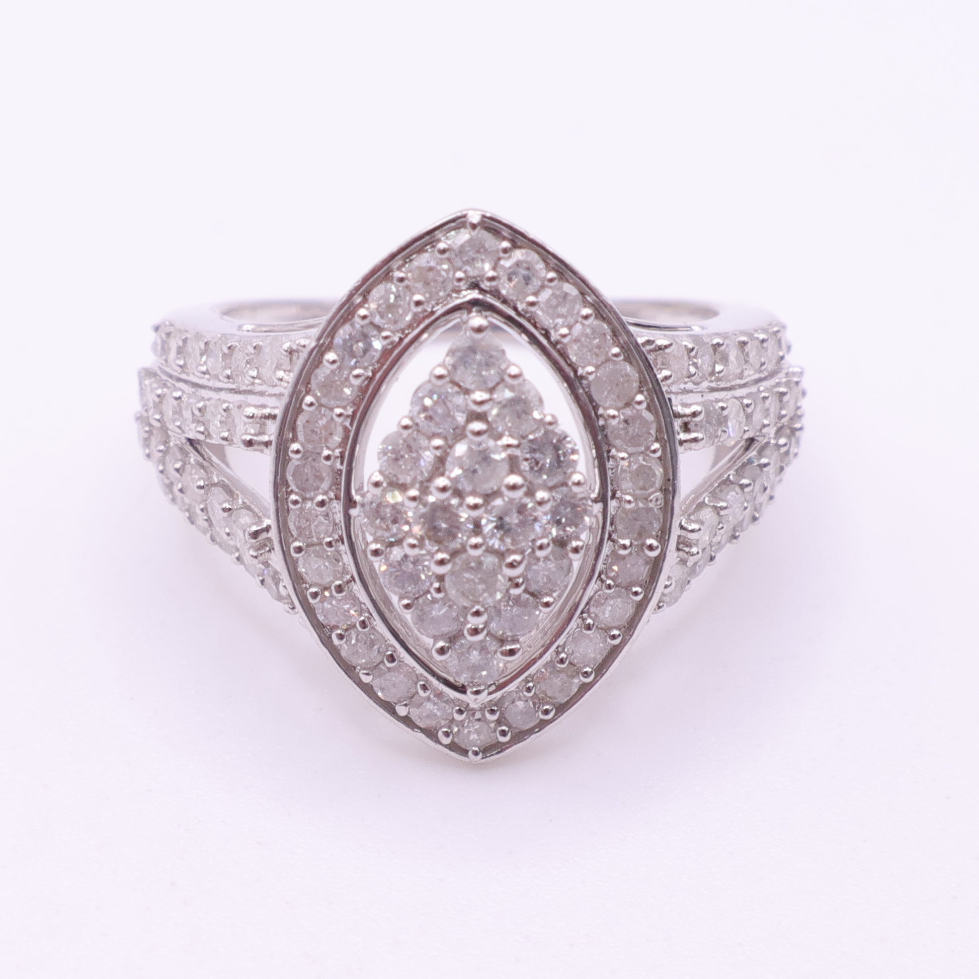 This second-hand 10ct white gold ring features a marquise-shaped diamond cluster centre, framed by a halo of smaller diamonds for added definition. The split shoulders are also diamond set, leading neatly into the central setting and giving the ring a balanced, layered look with plenty of surface detail. The marquise shape sits lengthways on the finger, creating an elegant, elongated profile.