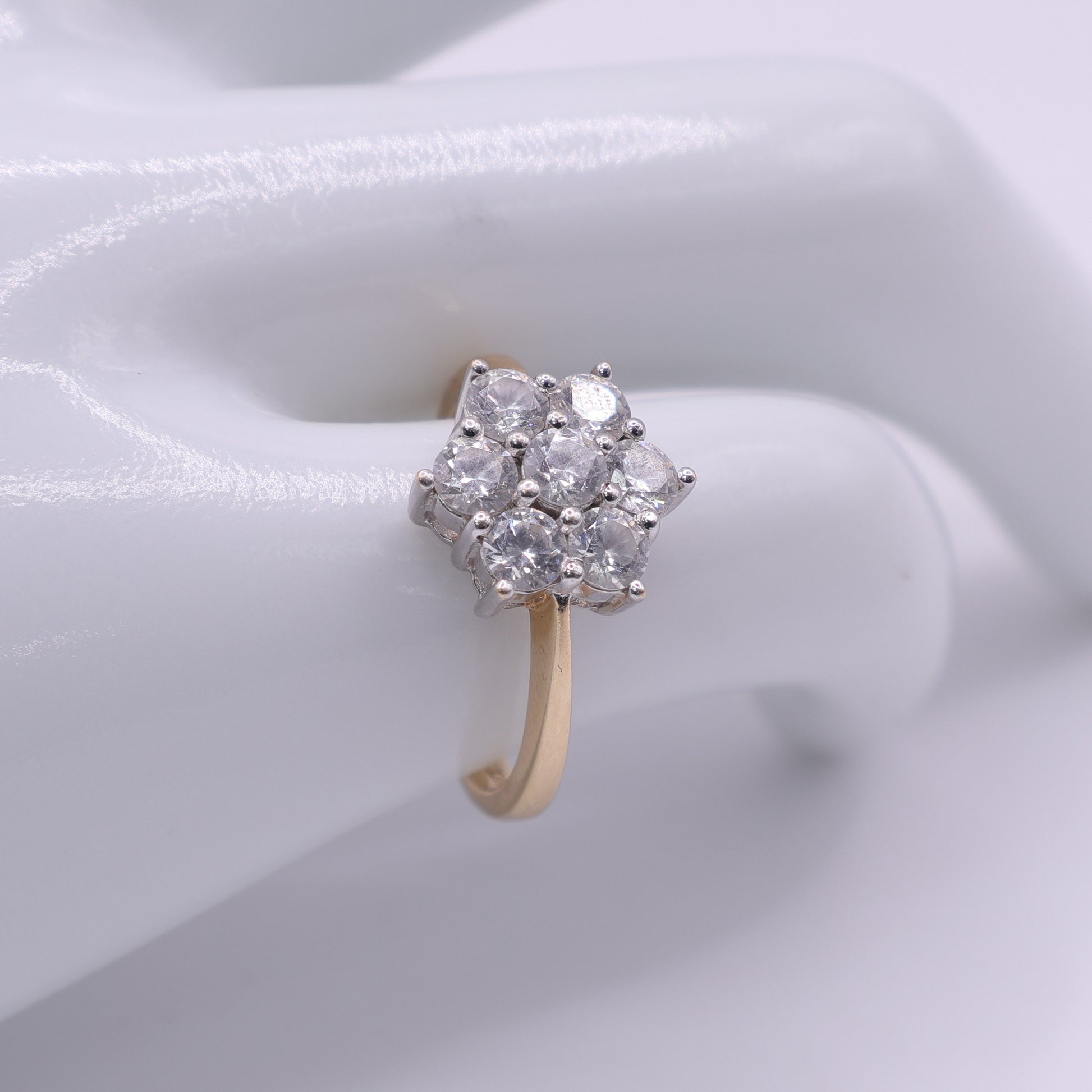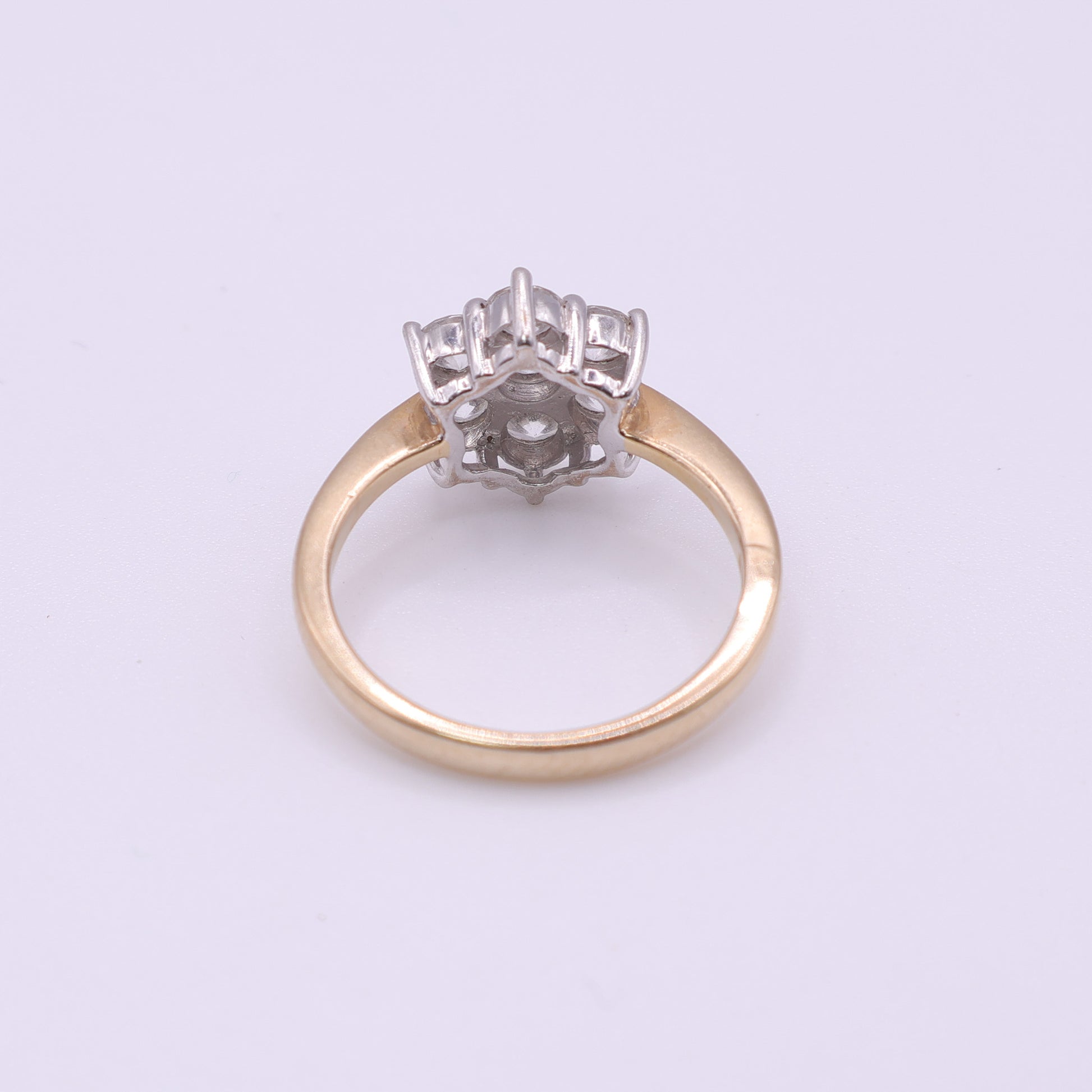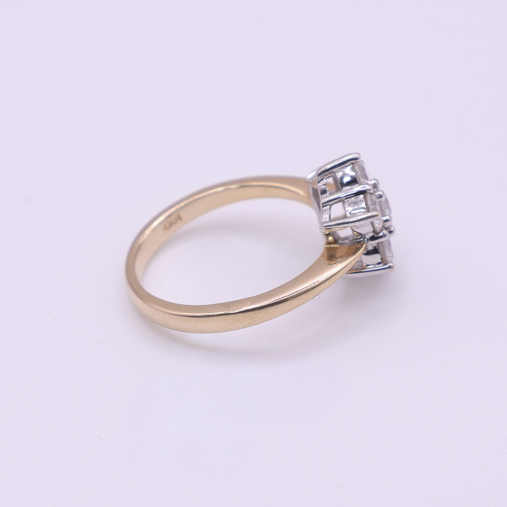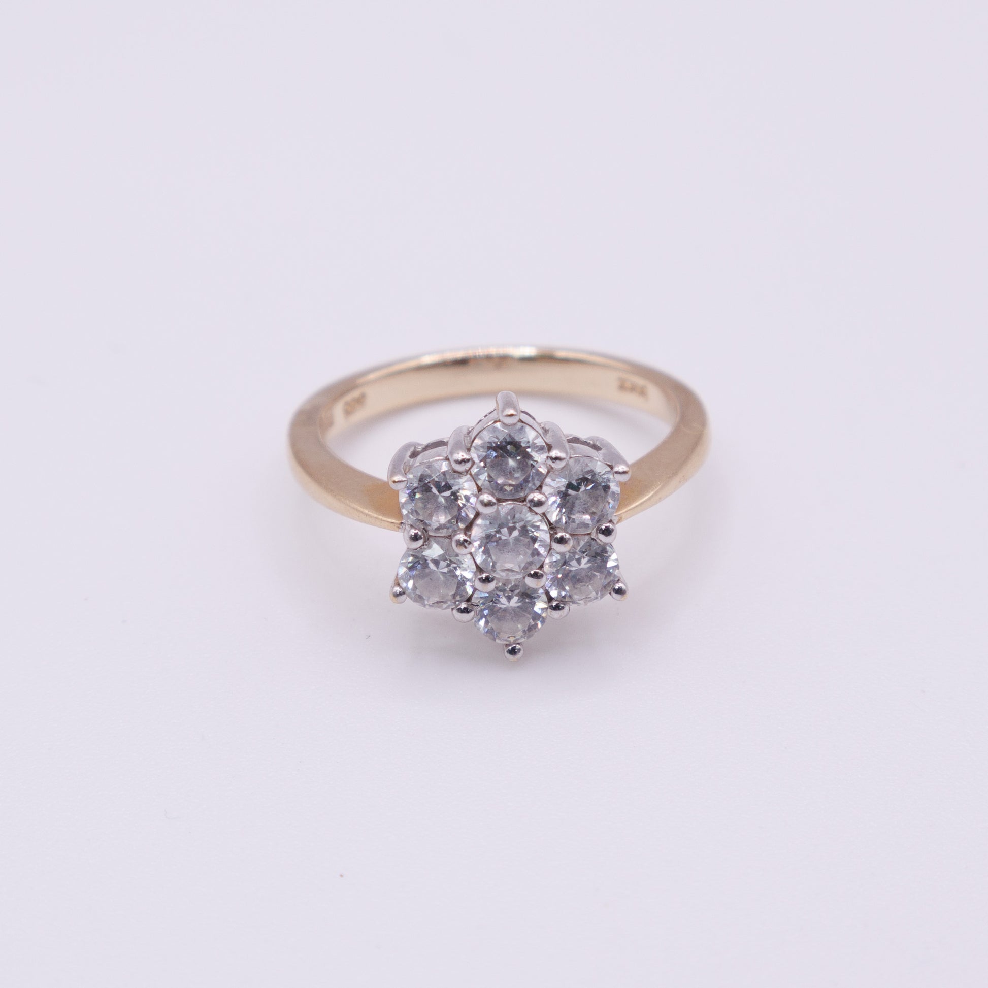 This 14ct yellow gold ring is set with a bright cluster of clear cubic zirconia stones in a white gold setting, giving the piece a classic floral look with a nice sparkle. The band is stamped 585 along with the maker’s mark, and the ring has been fully checked and cleaned before listing.