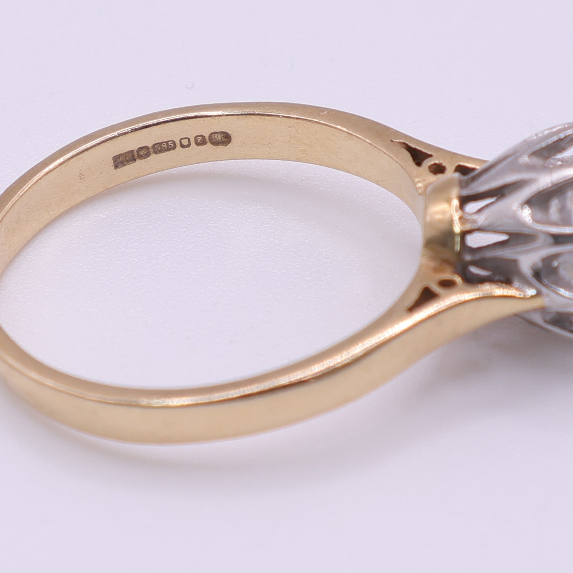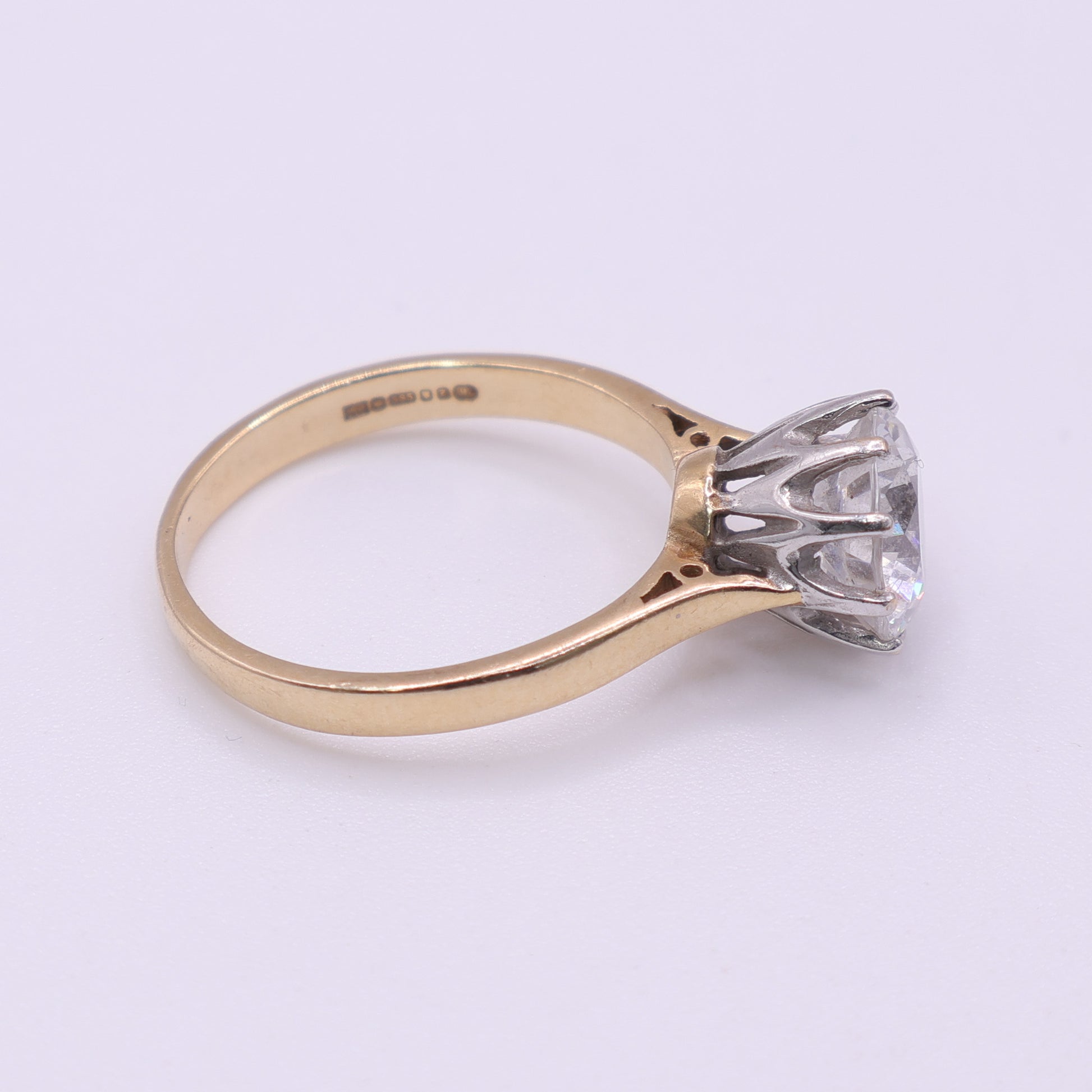 This second-hand solitaire ring is crafted in solid 14ct yellow gold and set with a single round CZ stone in a raised claw setting. The elevated setting allows light to pass through the stone, giving it strong sparkle and a classic solitaire look. The shoulders taper smoothly into the setting, with subtle openwork detail visible from the side.