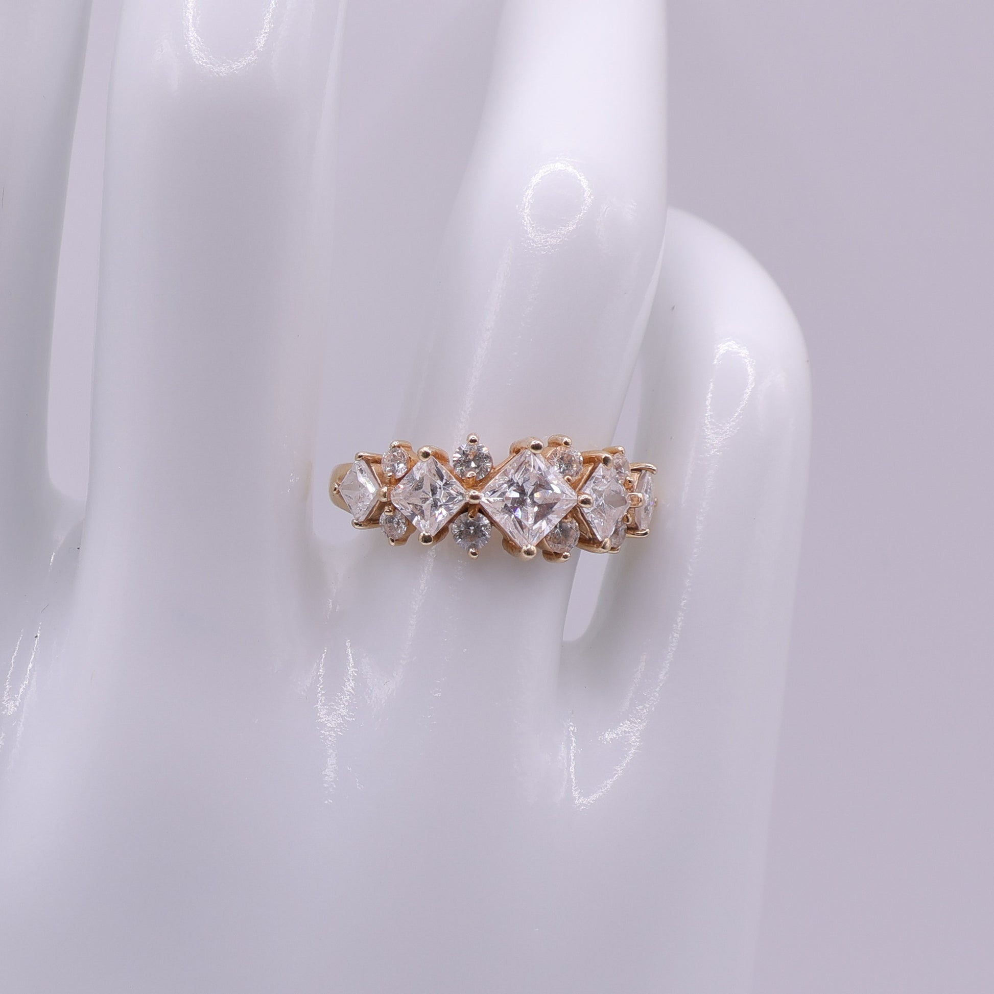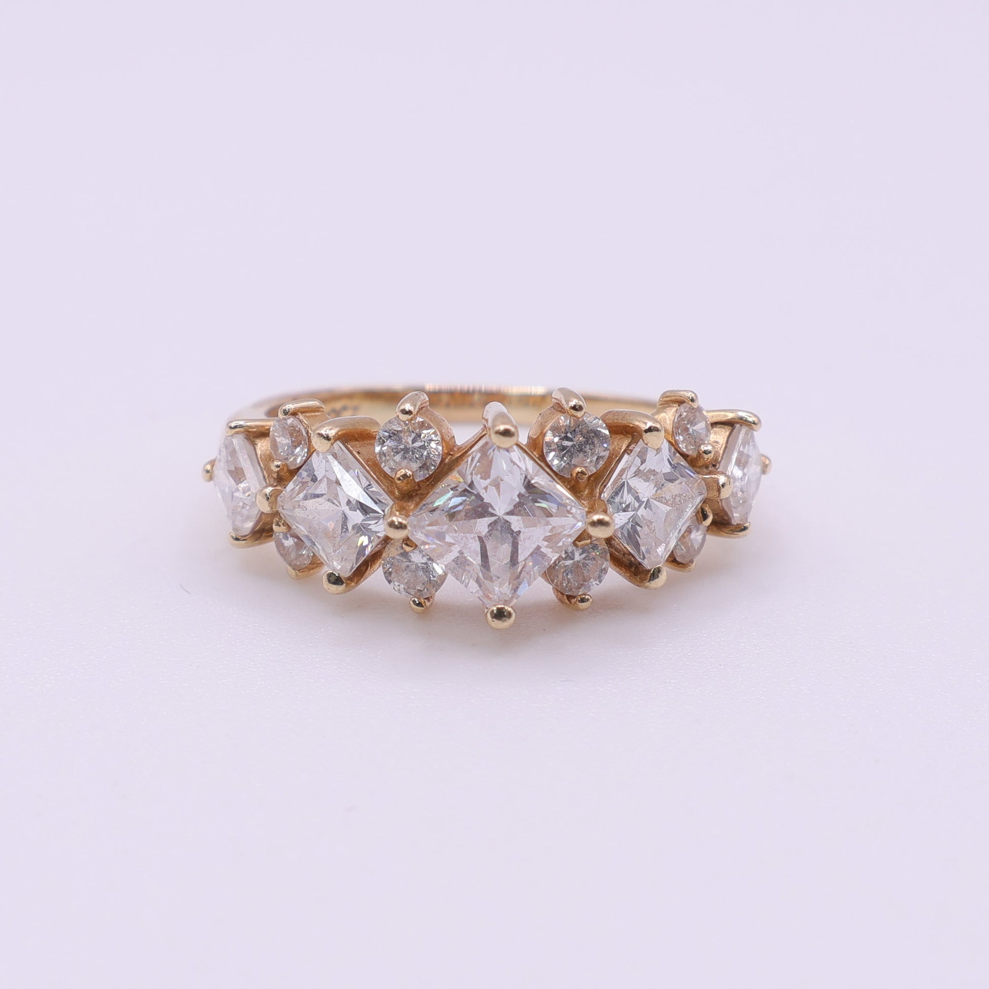 This second hand 14ct yellow gold ring features a mix of princess and round cut clear cubic zirconia stones set in a multi-stone design across the band. The stones are securely claw set and give the ring a bright, eye-catching finish.