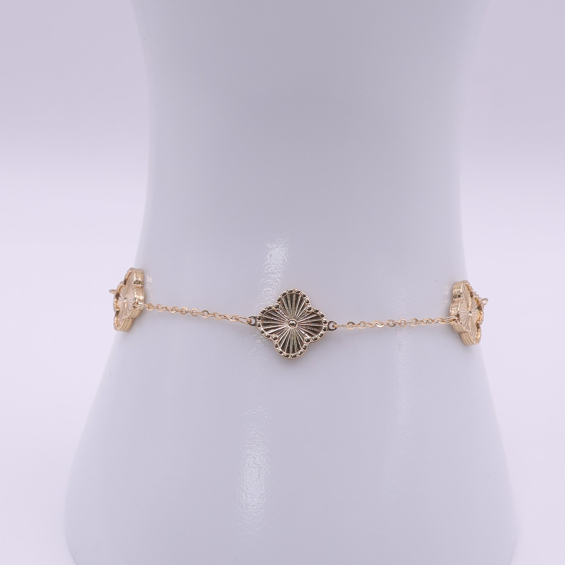 Second hand 18ct yellow gold station bracelet featuring a series of polished clover motifs spaced evenly along a fine gold chain. The clover links have a detailed textured finish that catches the light beautifully while keeping the overall look refined and wearable.