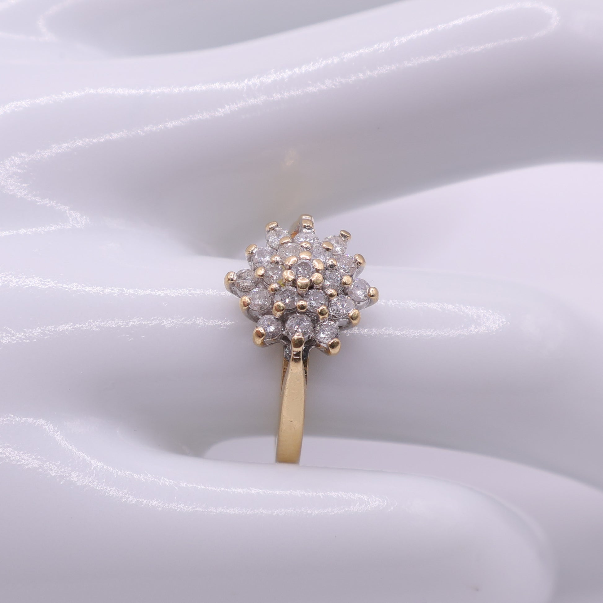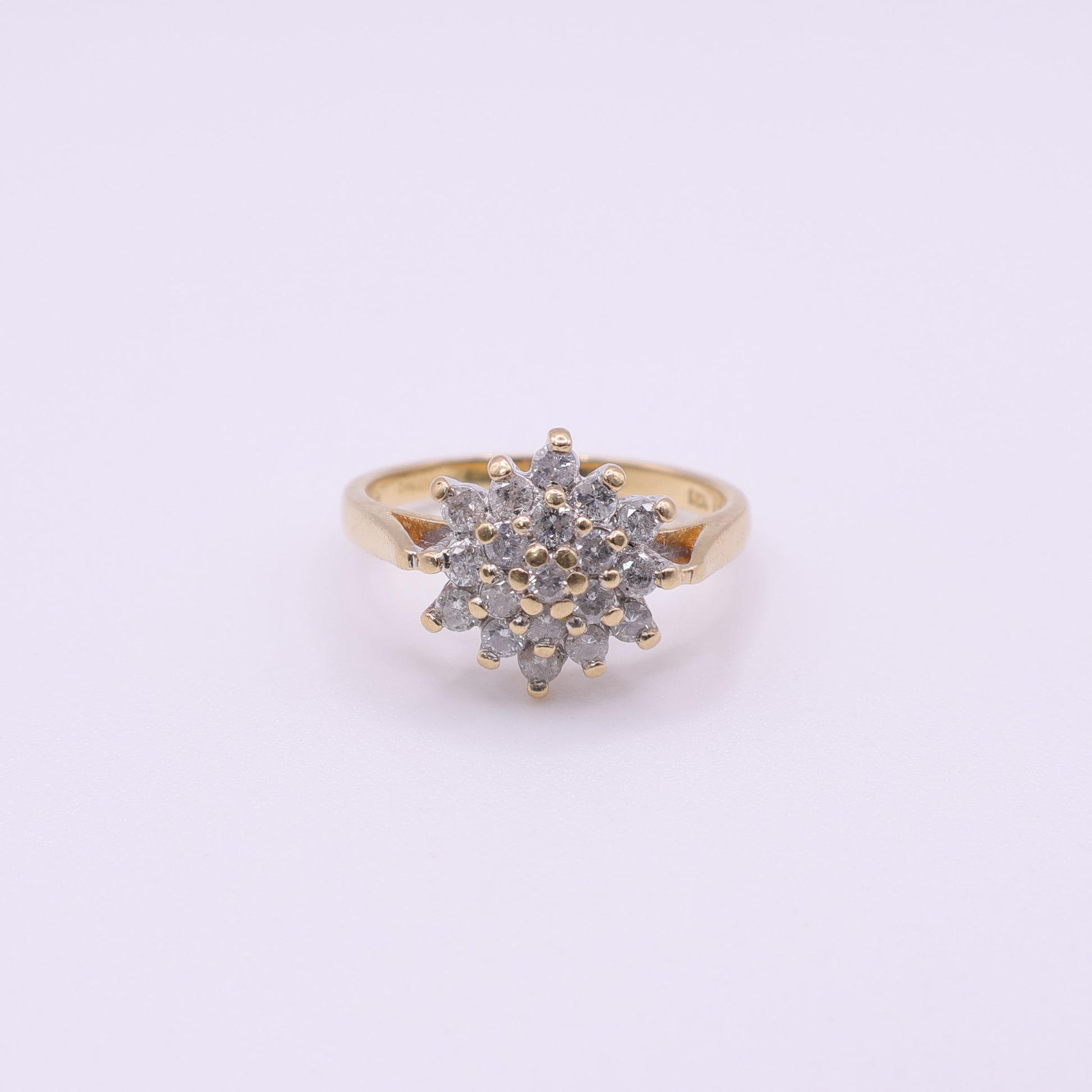 This second hand diamond cluster ring is crafted in solid 18ct yellow gold and features a classic raised cluster design set with multiple round brilliant cut diamonds.