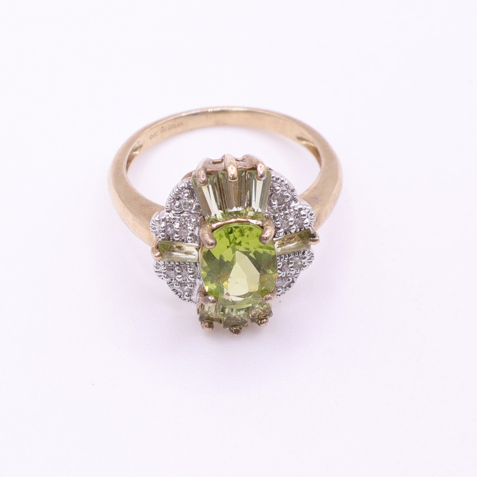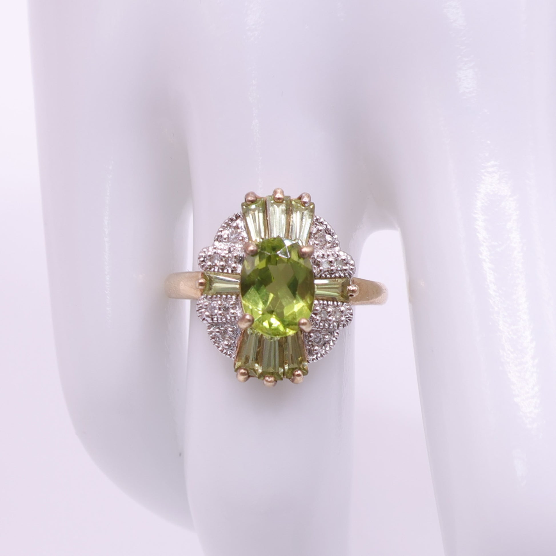 This second-hand 9ct gold ring features a vivid oval-cut peridot at the centre, held in a raised claw setting and surrounded by a cluster of small diamonds. Tapered peridot baguettes sit at the top and bottom of the central stone, adding definition and drawing the eye into the centre. The shoulders are diamond set, giving the ring extra detail while keeping the overall look balanced and wearable.