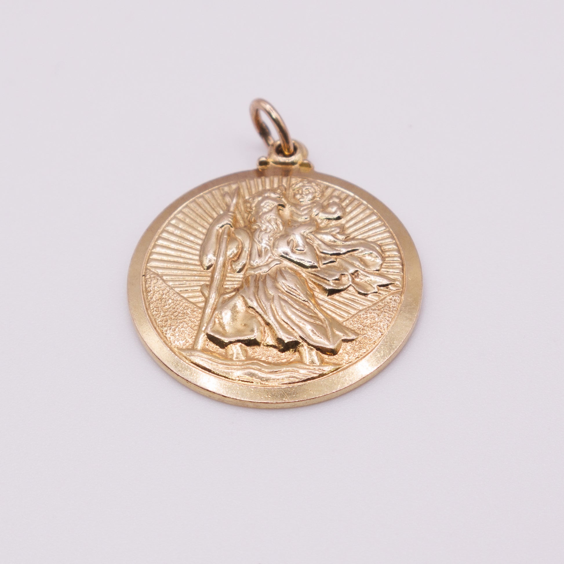 A beautifully crafted pre-owned 9ct gold St Christopher pendant featuring a raised relief design with striking sunburst detail. The bold textured finish around the border contrasts with the smooth central image, giving the piece real depth and character. Fully hallmarked on the reverse and fitted with a sturdy jump ring, ready to wear or gift.