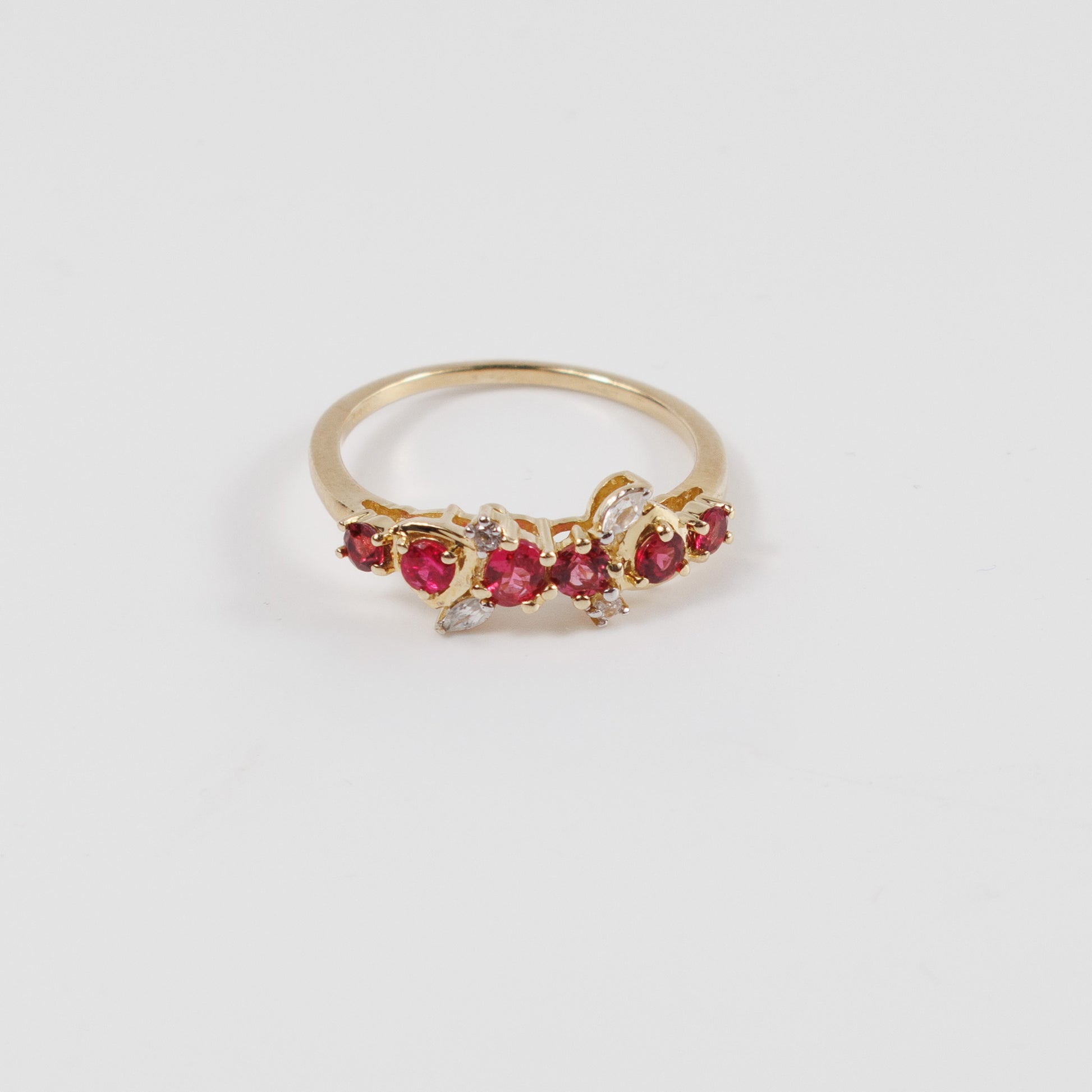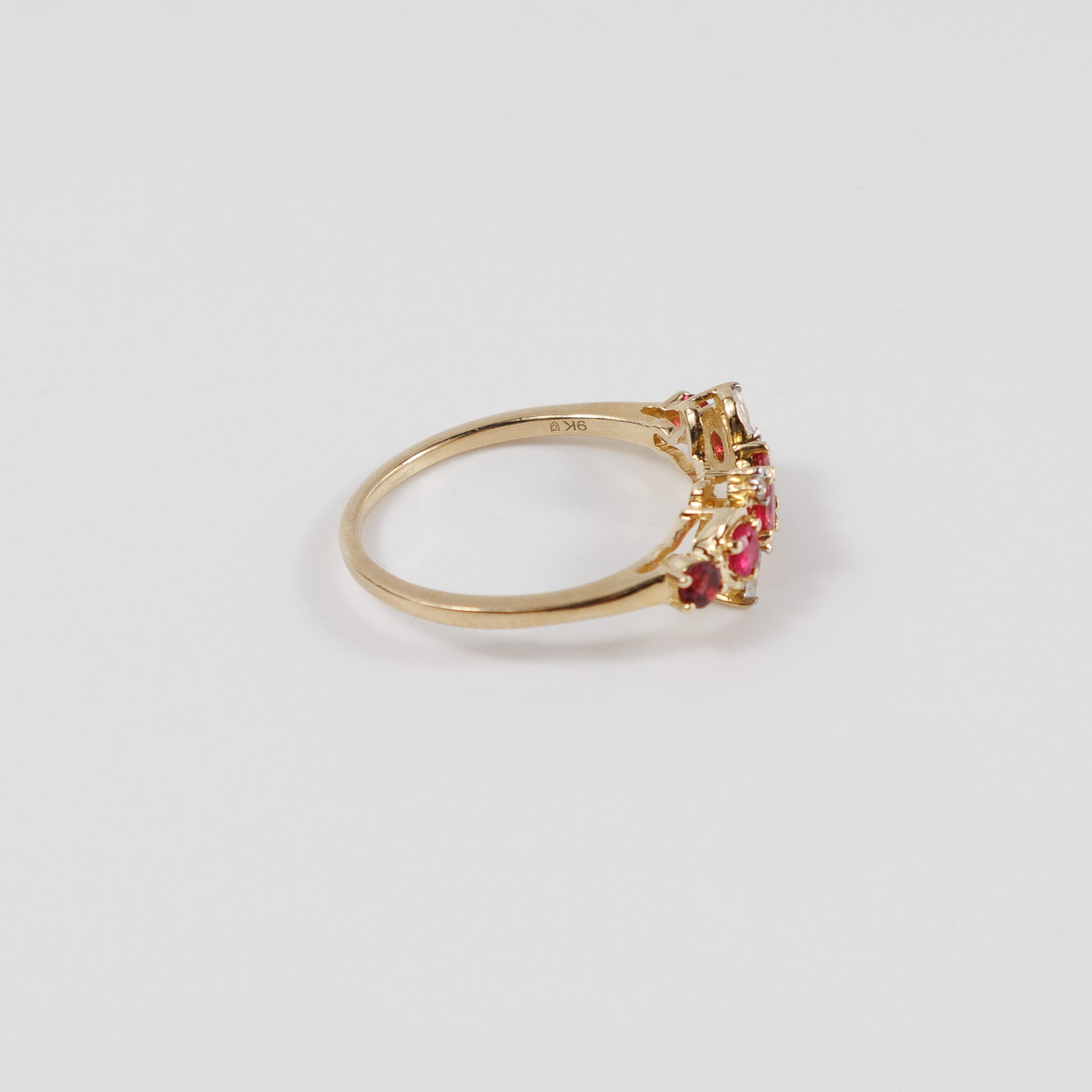 This second-hand 9ct gold ring features a cluster of deep red stones accented with sparkling clear stones. The rich colour of the gemstones is beautifully complemented by the warm gold band, creating a timeless and eye-catching piece. The ring is in very good second-hand condition, showing only light wear consistent with age, making it a classic addition to any jewellery collection.