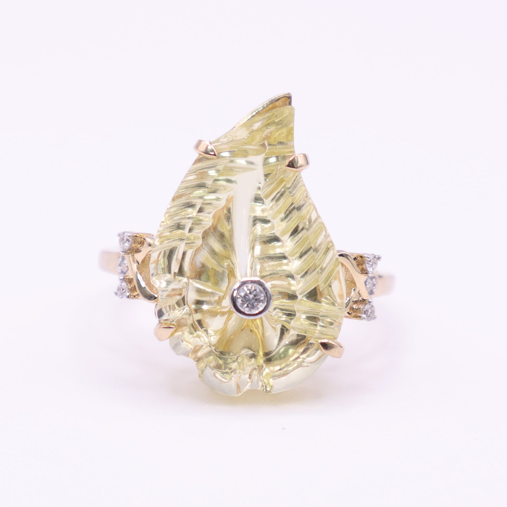 This second hand 9ct gold ring features a carved yellow transparent centre stone set in a leaf style design, with small diamond accents set to each side. The ring is hallmarked for 9ct gold and has been checked for authenticity.