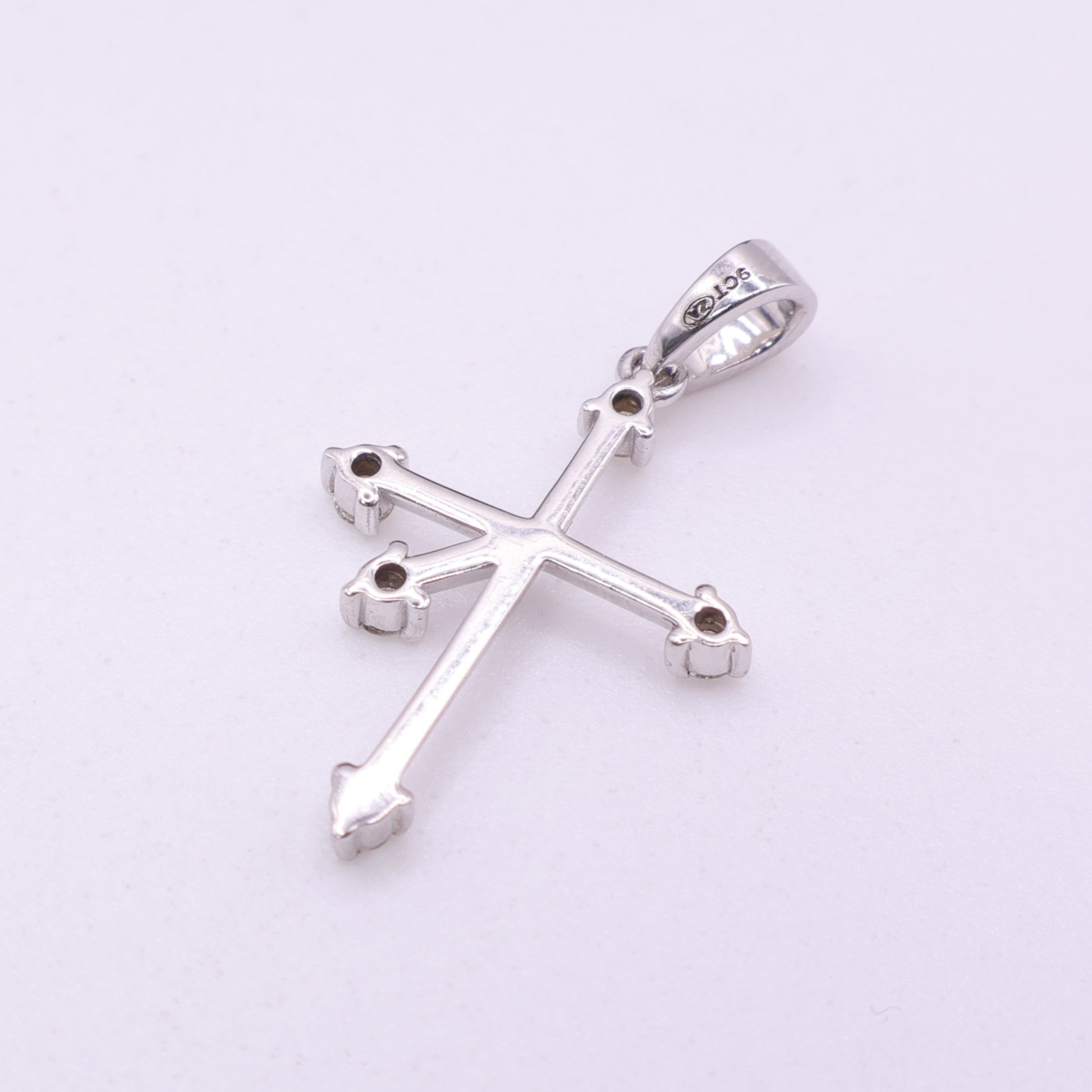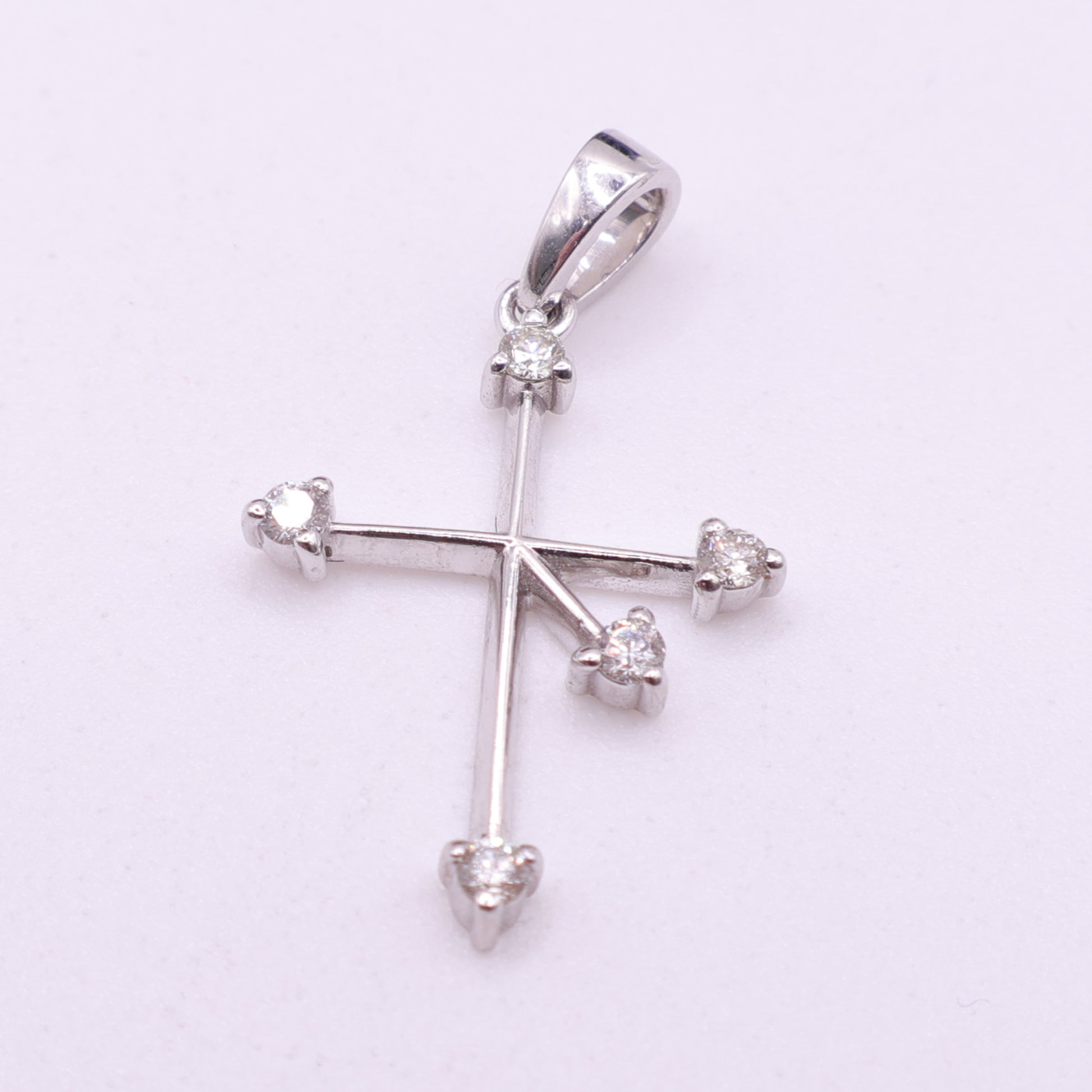 A delicate second-hand cross pendant crafted in polished 9ct white gold and set with sparkling diamonds. The design features a classic cross form with a modern twist, incorporating a diagonal bar across the centre and a diamond set at each point of the cross.