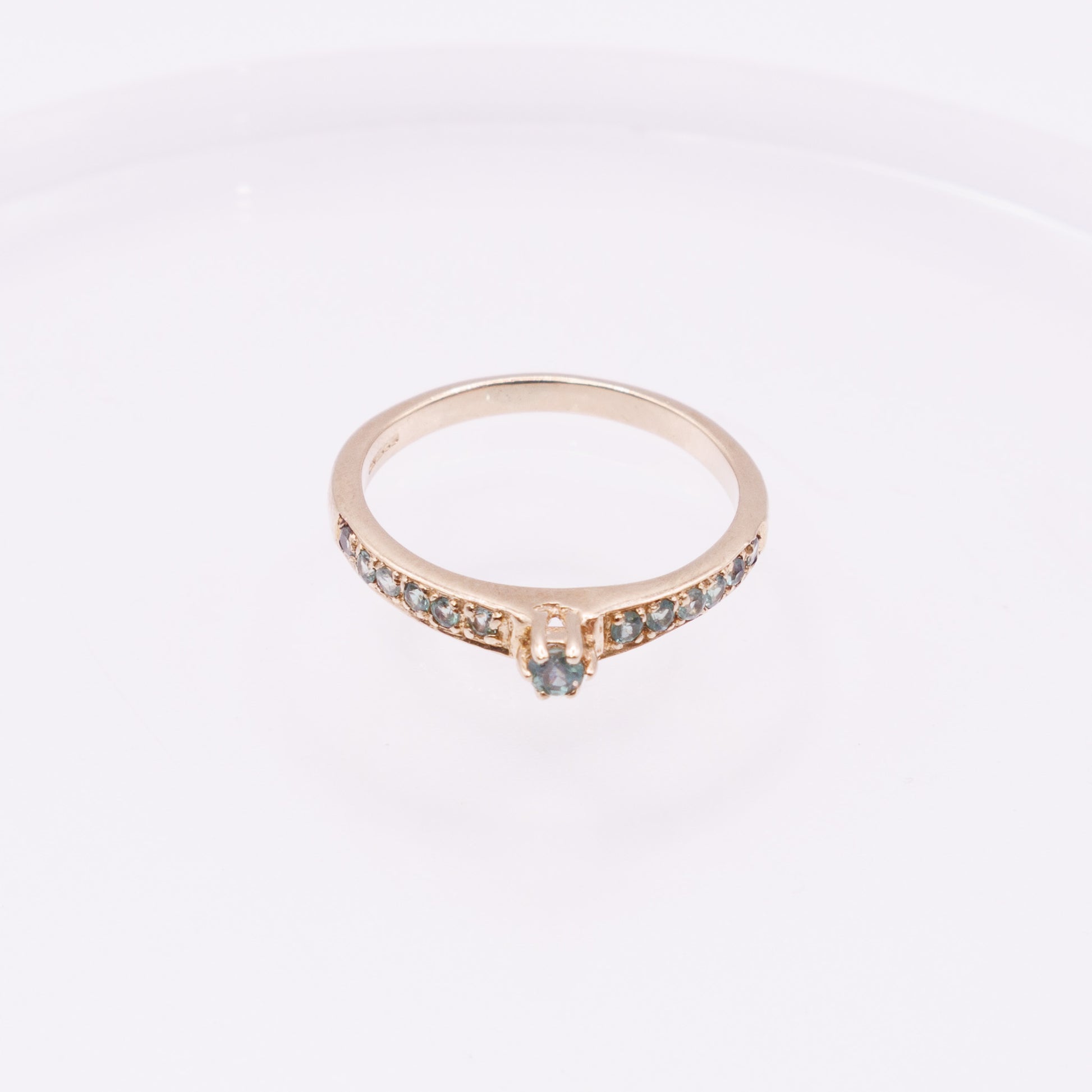 A pretty 9ct gold ring set with a single blue-green stone at the centre, complemented by smaller matching stones along each shoulder. The slim gold band gives it a delicate, refined look while the stones add a subtle touch of colour.
