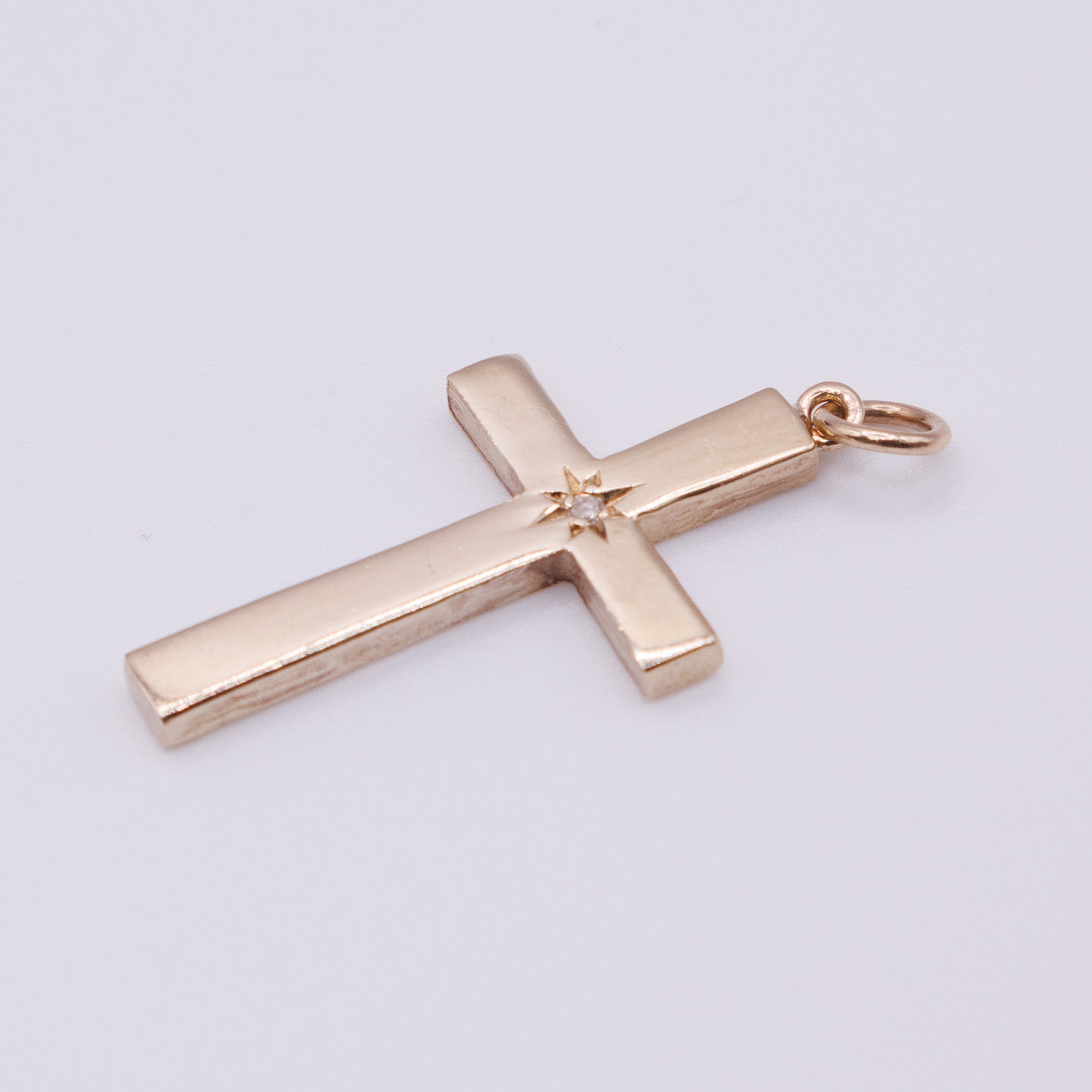 A classic pre-owned 9ct gold cross pendant featuring a single diamond set within a starburst design at the centre. The smooth polished finish and simple shape give it a timeless look, ideal for everyday wear or as a meaningful gift. Fitted with a secure jump ring, ready to hang from your favourite chain.