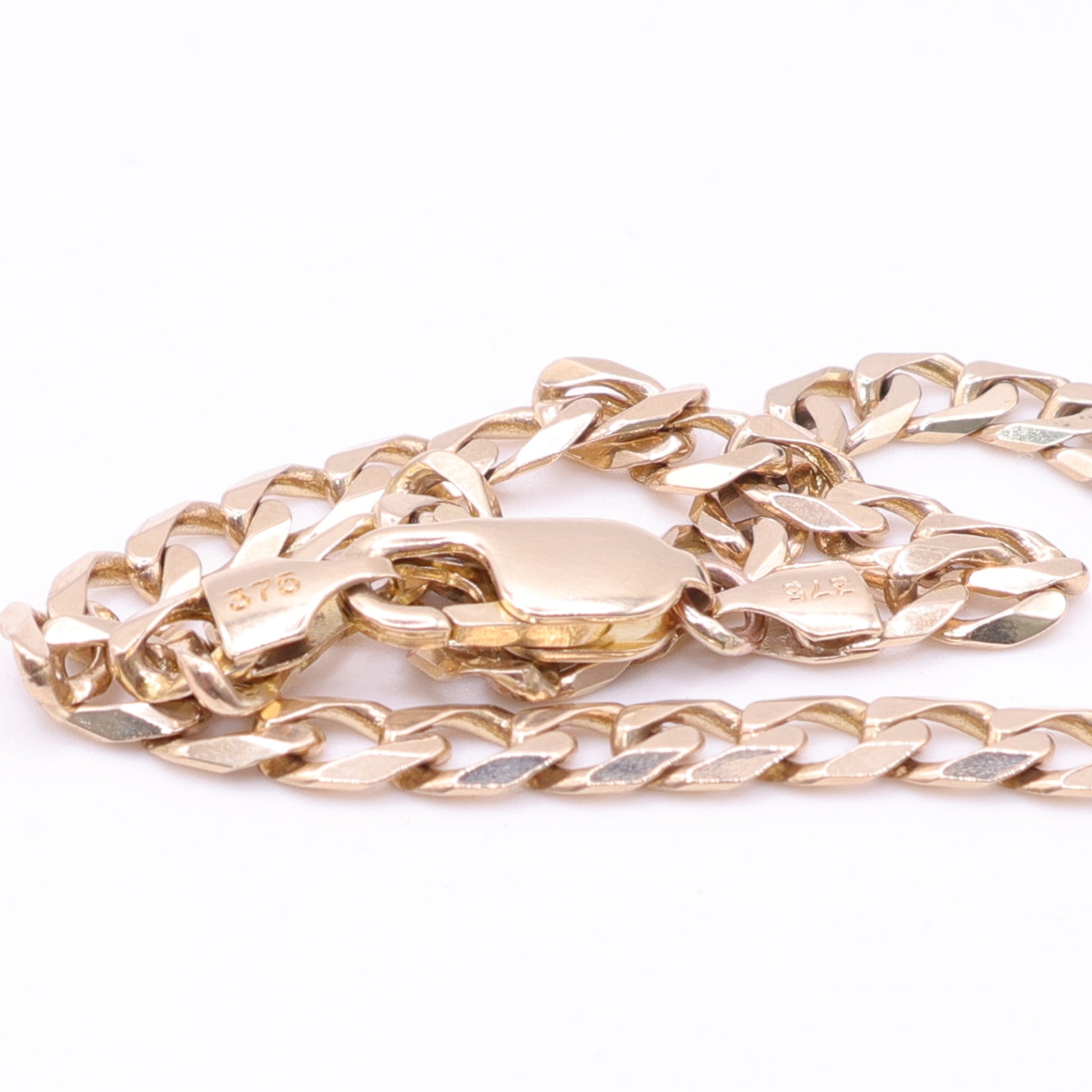 This second hand 9ct gold chain features a classic curb link design with polished, closely interlocking links that sit neatly against the neck. The links have a flat profile, giving the chain a clean finish and a solid feel when worn.
