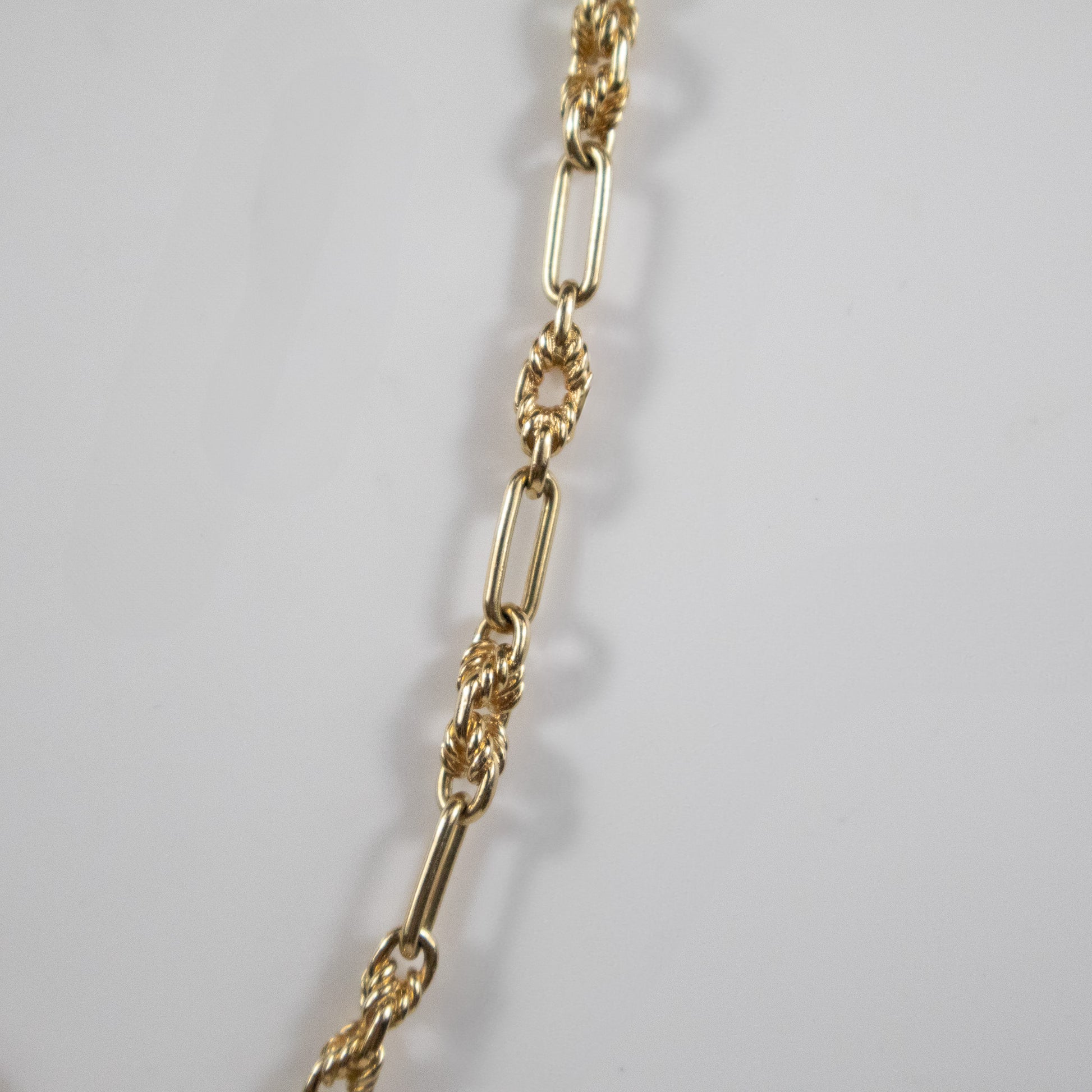 A beautifully crafted 9ct yellow gold fancy link chain, featuring alternating textured and polished links for a unique and eye-catching design. Measuring 16 inches in length, this second-hand piece is fully hallmarked for authenticity and gold purity. Perfect for wearing on its own or pairing with a pendant, it offers both elegance and durability for everyday wear.