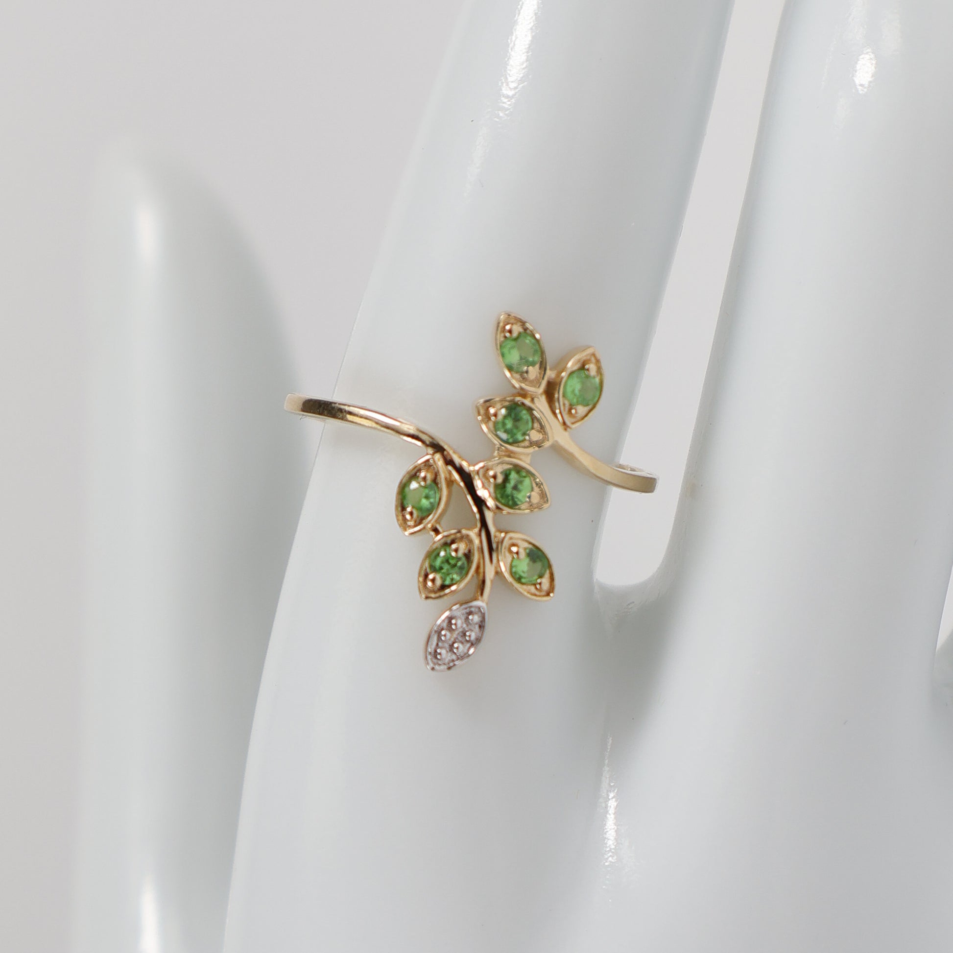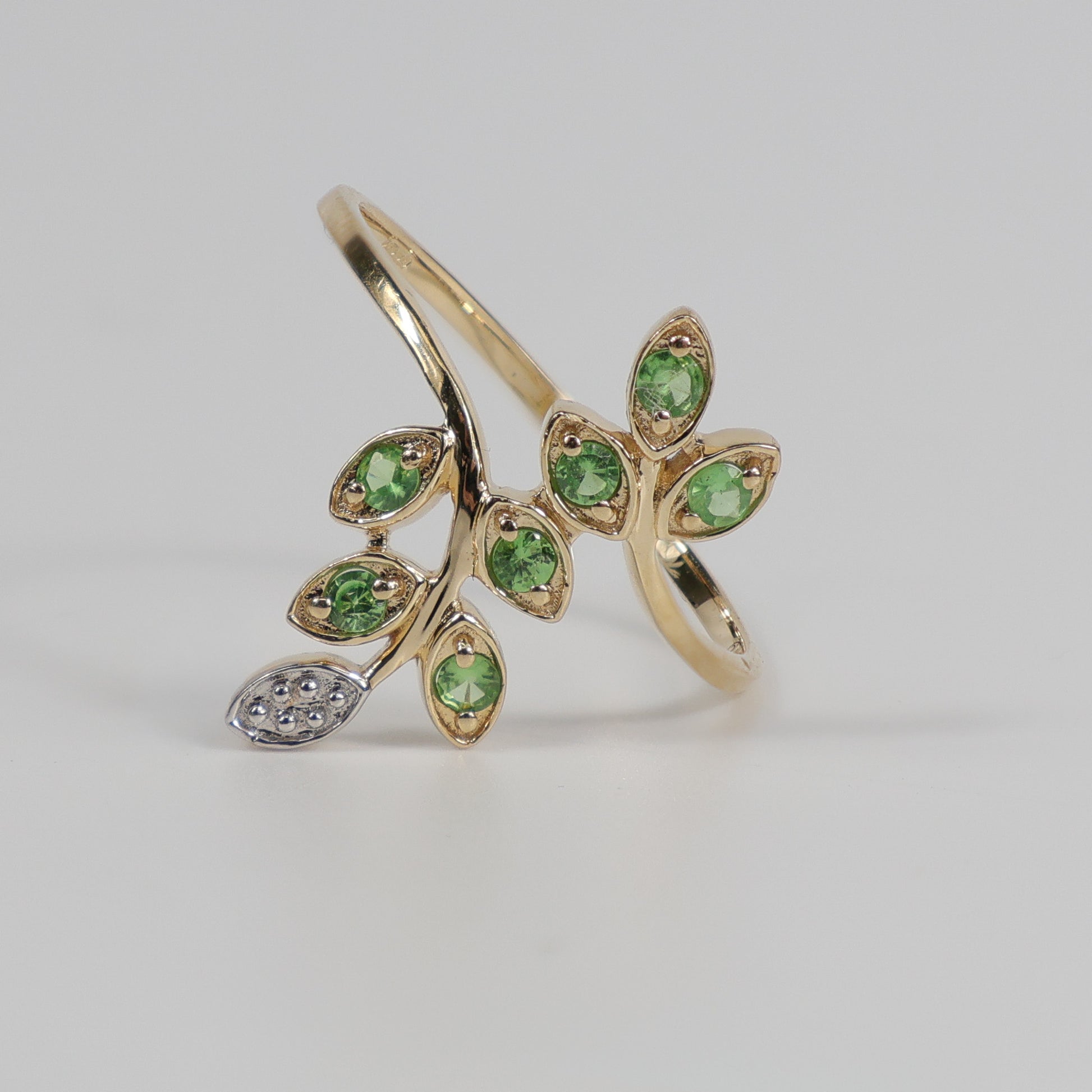 This second-hand 9ct gold ring is designed in a delicate leaf and vine style, set with vibrant green stones that bring a fresh and elegant touch. The open wrap design makes it both stylish and comfortable to wear, with the polished gold band enhancing the bright sparkle of the gemstones. The ring is in very good second-hand condition, showing only light wear consistent with age. A charming and nature-inspired piece to add to any jewellery collection.