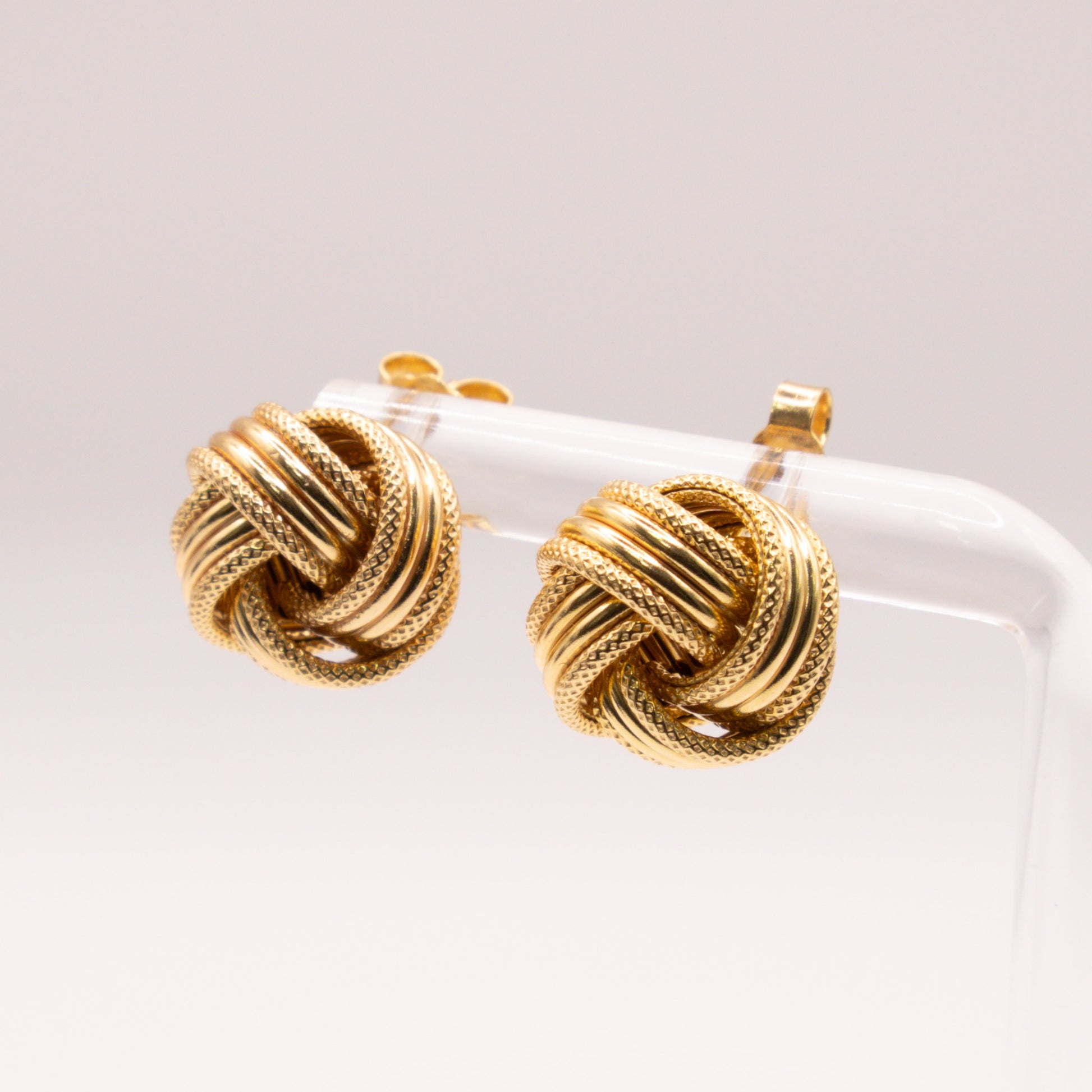 These second-hand 9ct yellow gold knot stud earrings feature an elegant textured and polished finish, giving them a timeless appeal. Designed with butterfly backs for secure wear, they are a versatile choice for both everyday use and special occasions. Fully tested and authenticated, these pre-owned earrings are a jewellery box staple.