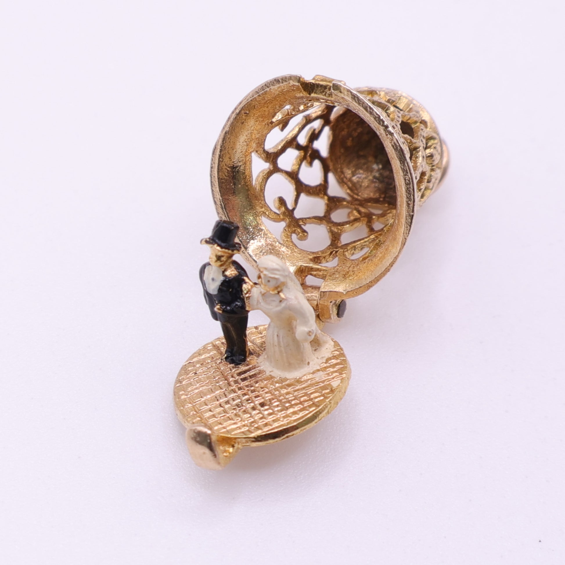 This second hand opening bell charm is made from solid 9ct yellow gold and features a detailed openwork body with a domed top and suspension loop. The charm opens on a hinge to reveal enamelled bride and groom figures standing on a textured gold base, with black and white enamel detailing.