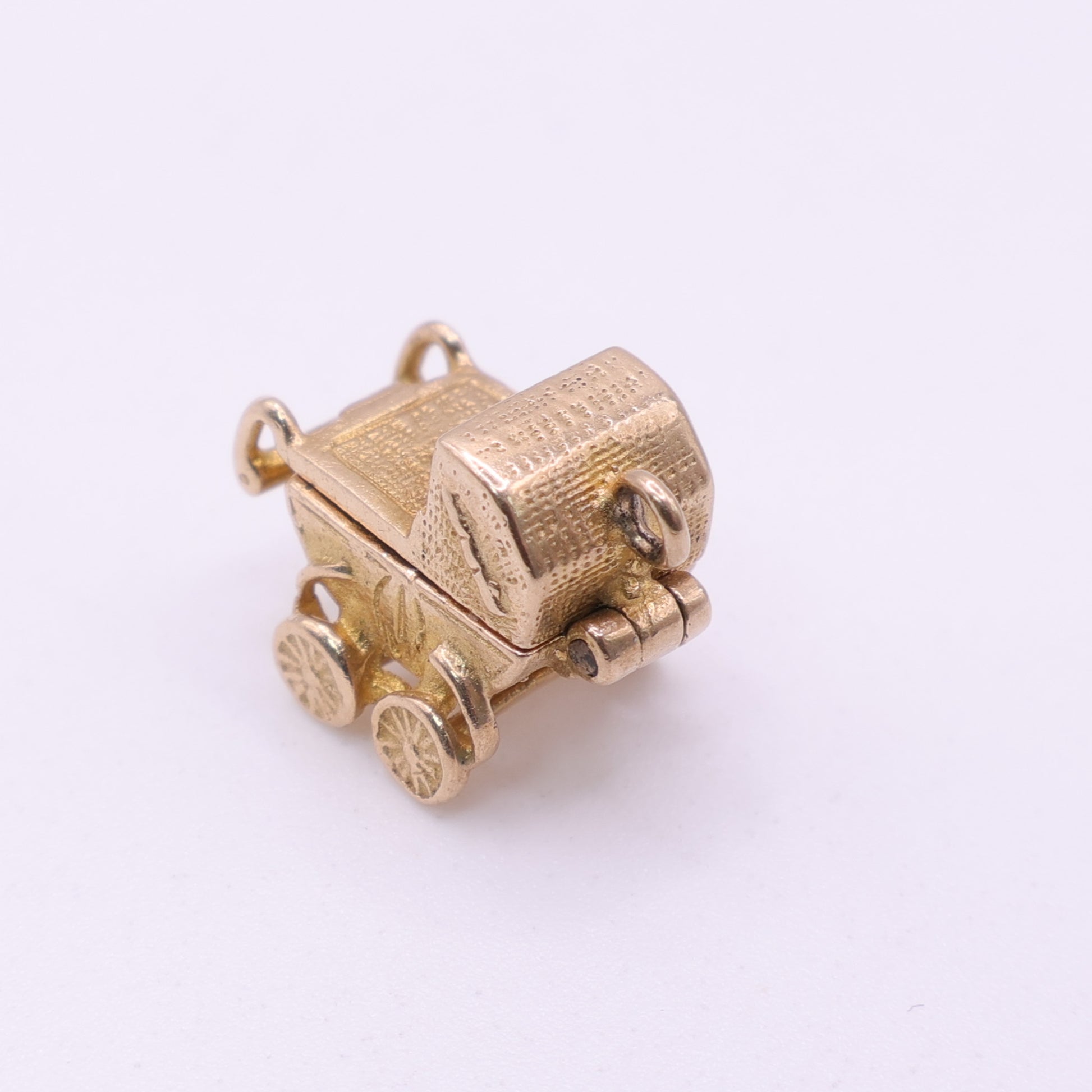 This second hand opening pram charm is made from solid 9ct yellow gold and is modelled as a traditional baby carriage with detailed wheels and handle. The charm opens on a hinge to reveal a small baby figure inside, with textured detailing to the exterior.