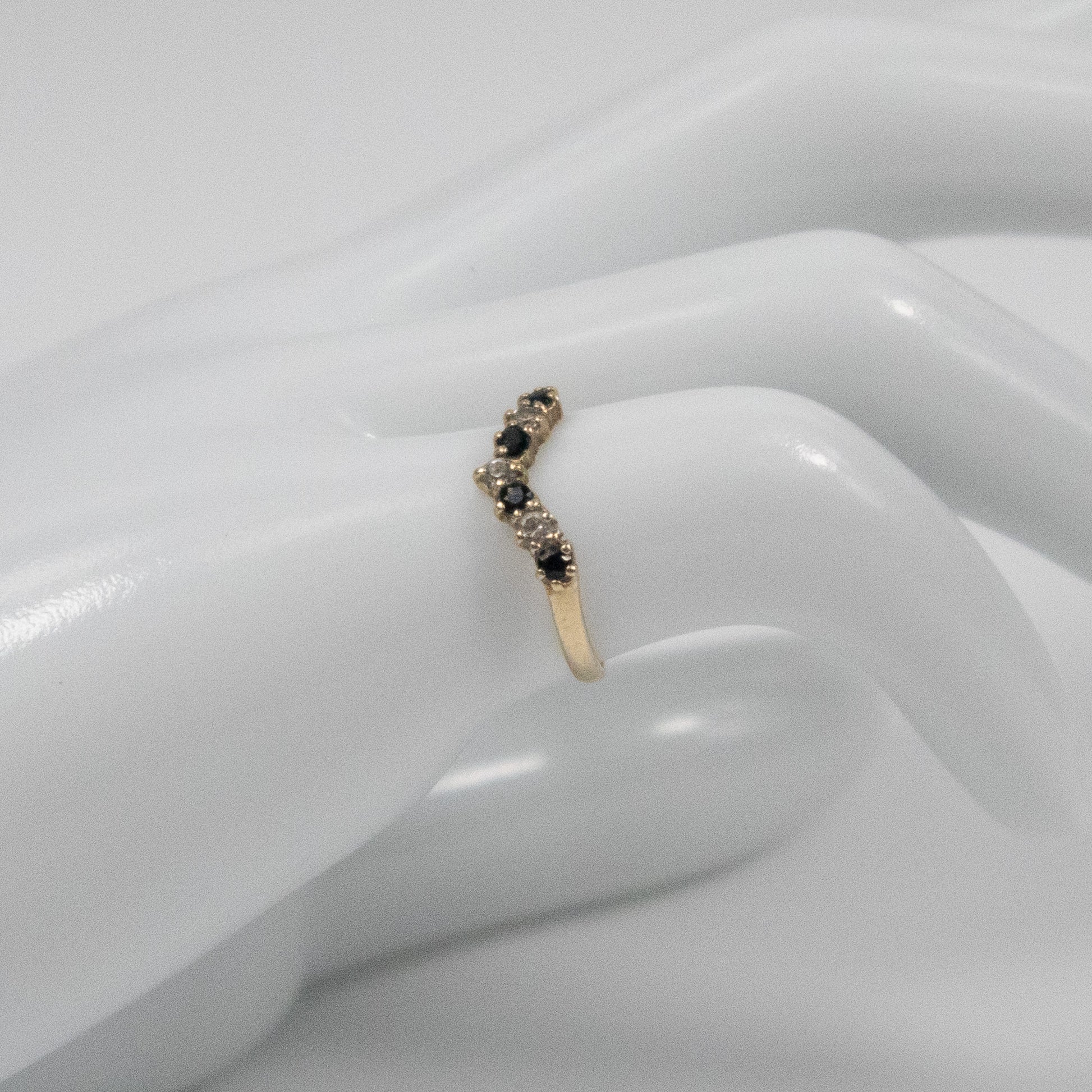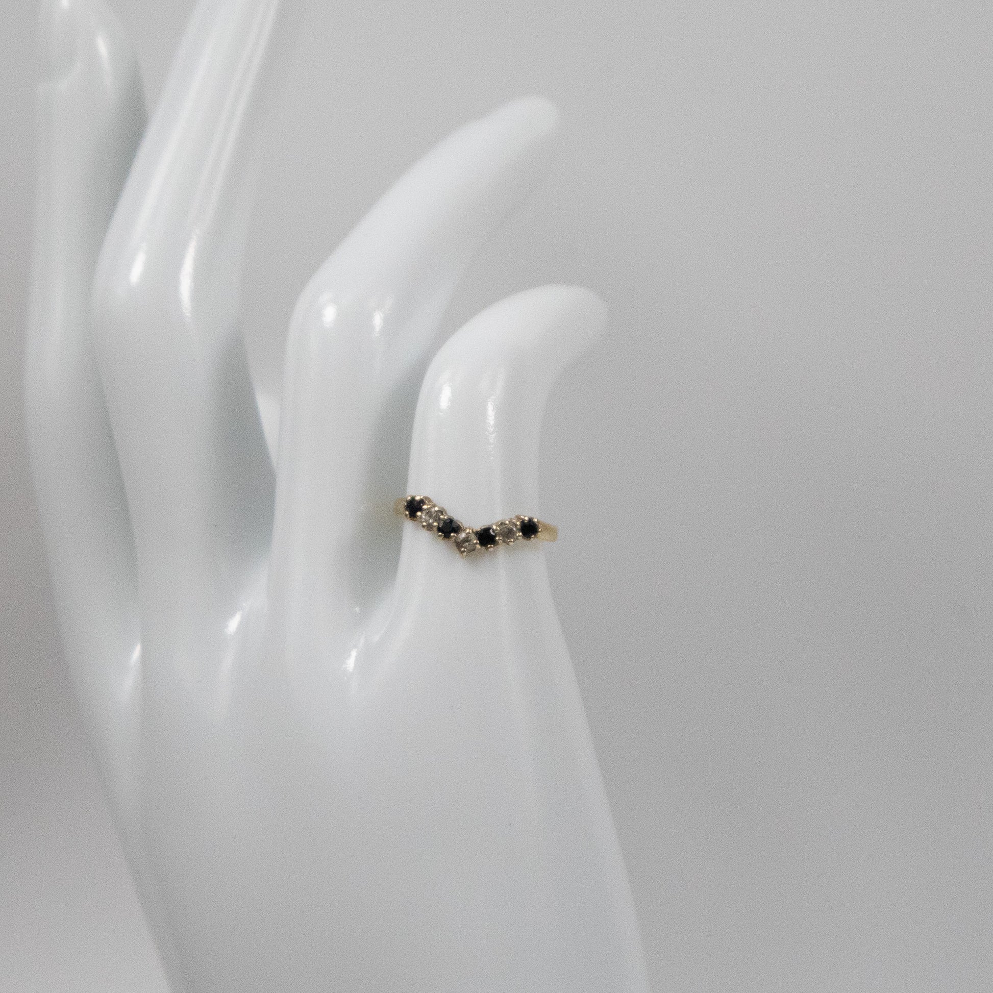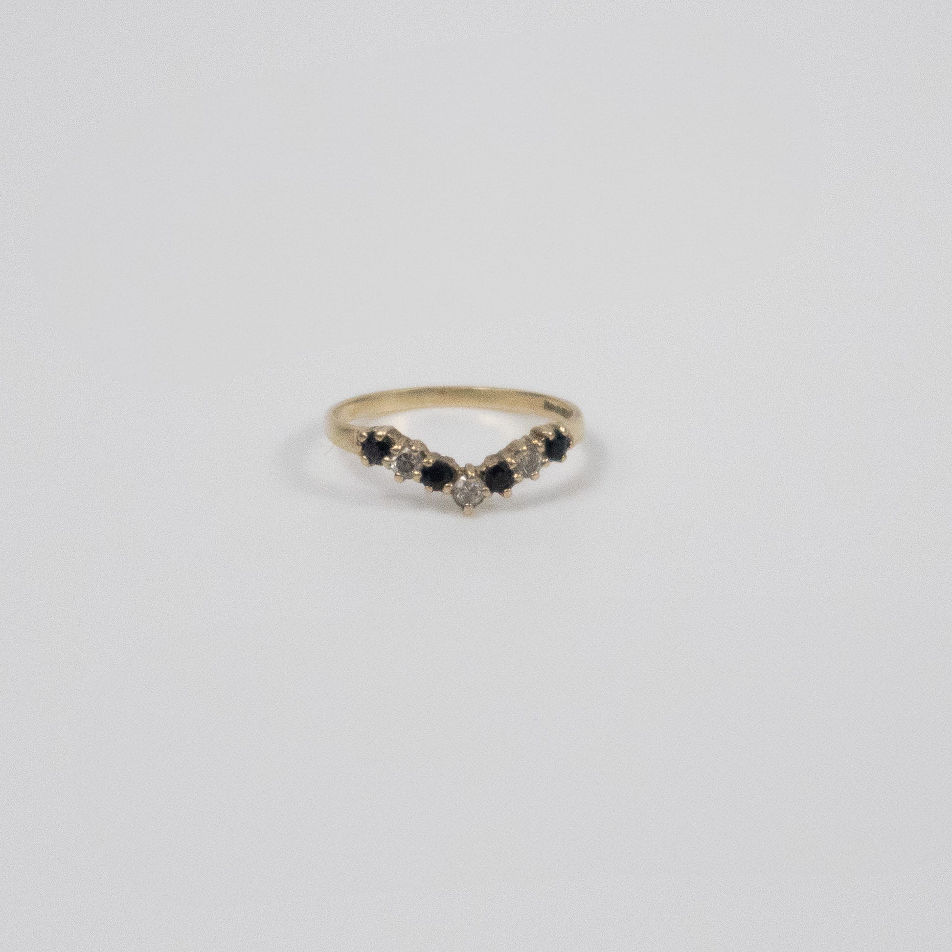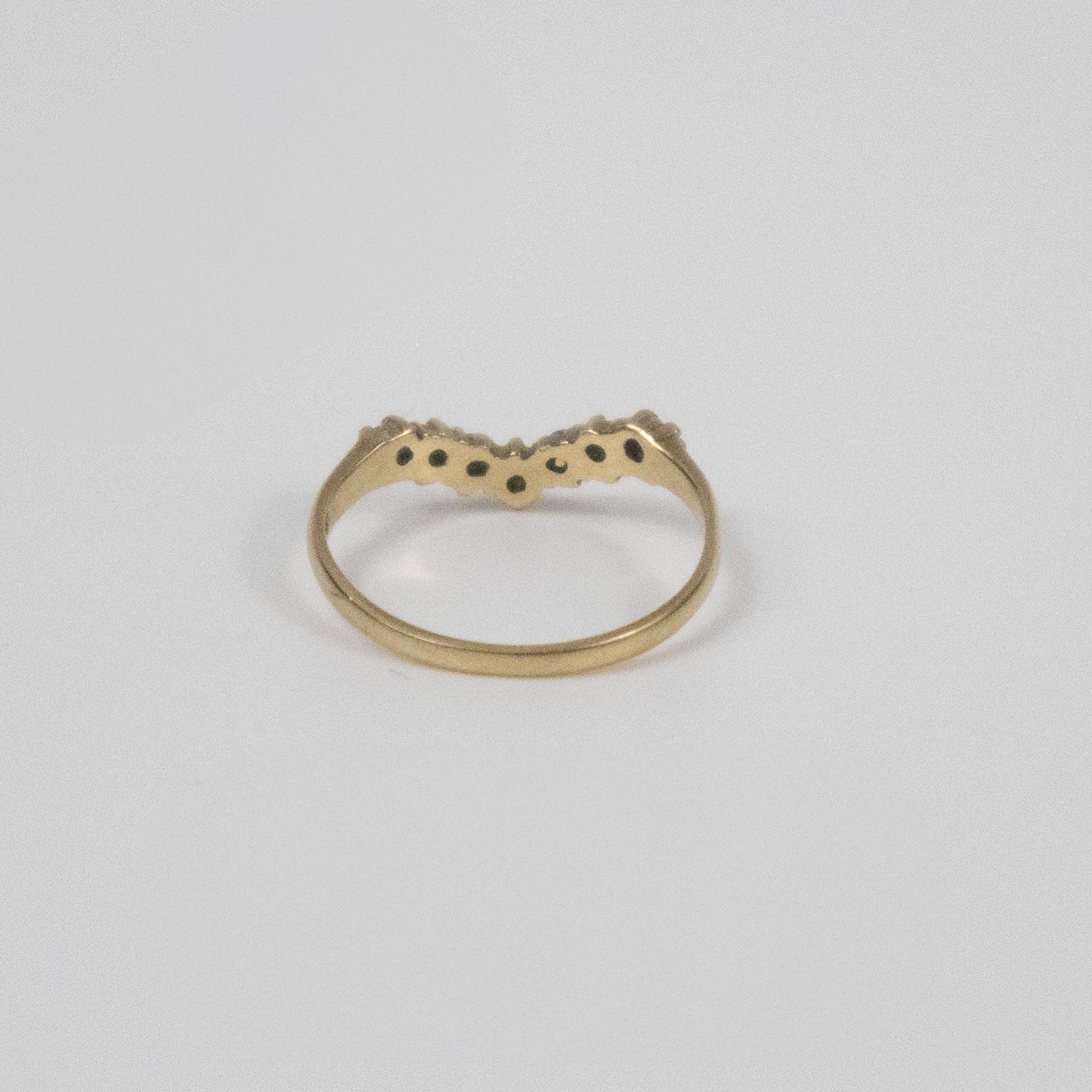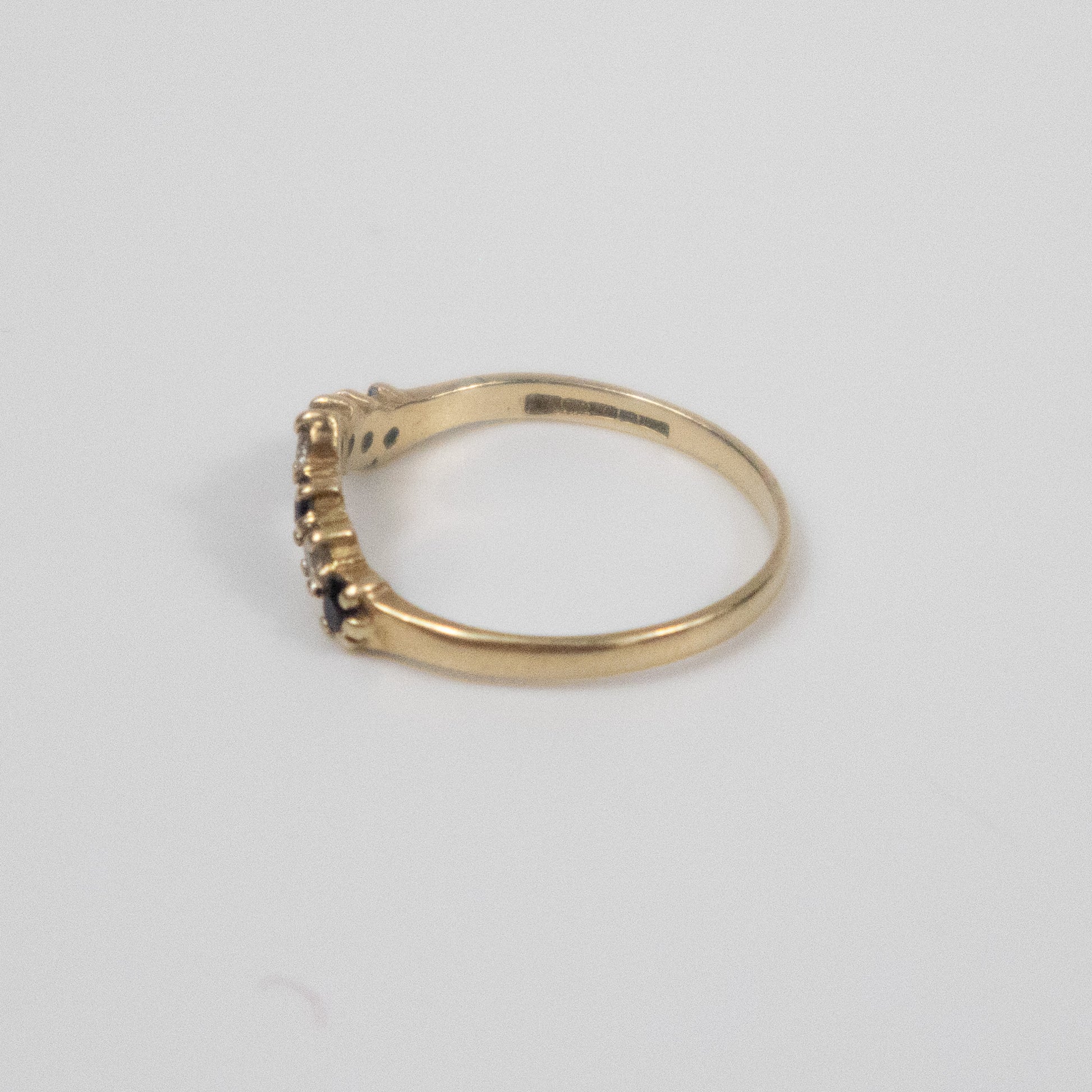 This second-hand 9ct gold ring is set with alternating round-cut sapphires and diamonds arranged in a stylish chevron shape. The V-shaped design gives it a distinctive look, perfect for wearing on its own or paired with another ring as a stacking or enhancer band. Crafted in solid 9ct yellow gold, this piece combines rich colour with timeless sparkle, making it a versatile addition to any jewellery collection. This ring is in very good condition with light wear consistent with age.