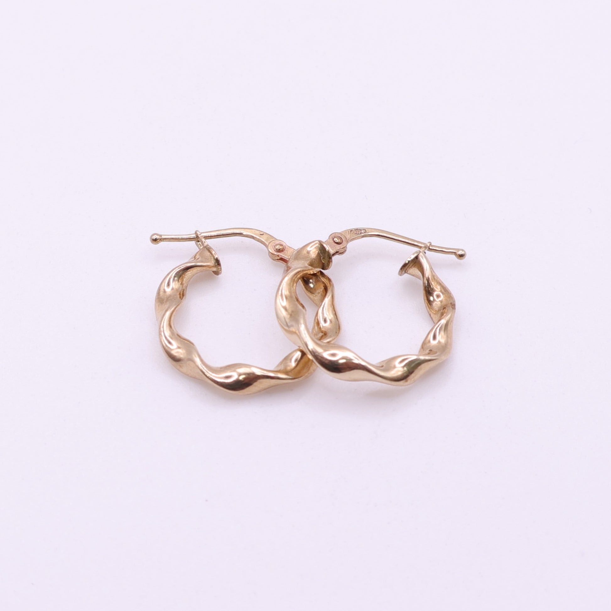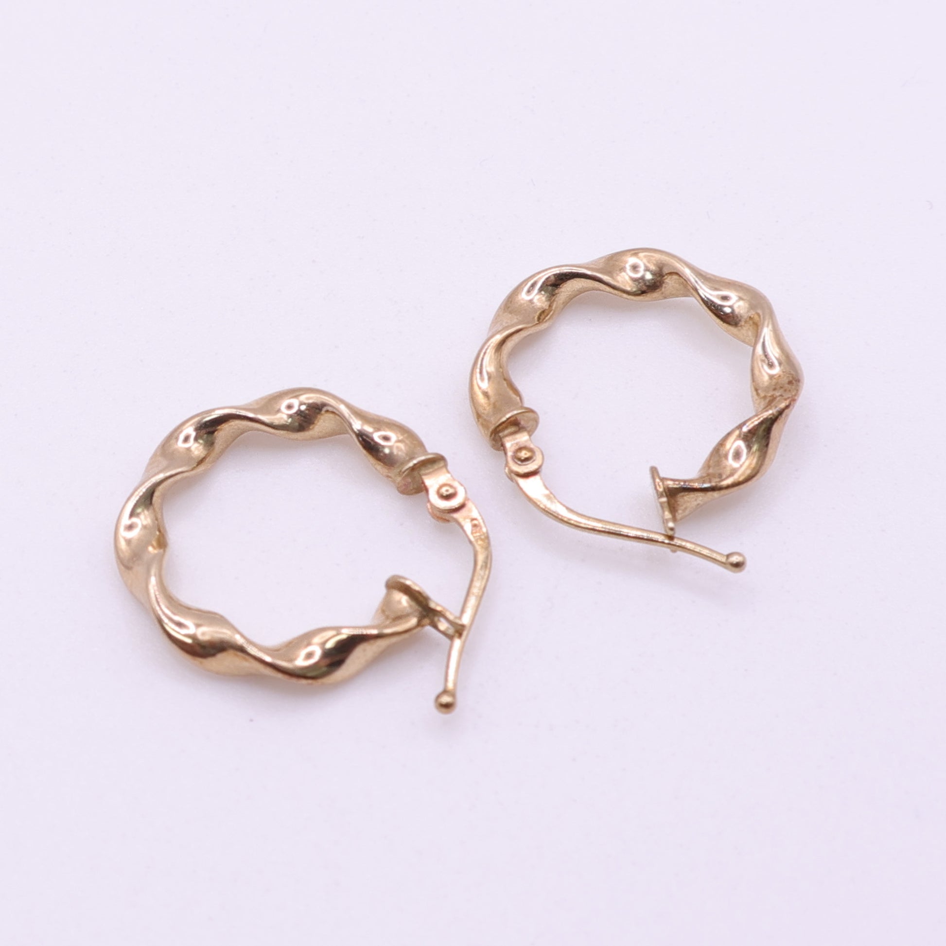 A distinctive pair of second-hand 9ct yellow gold hoop earrings featuring a sculpted twisted design that gives the hoops a fluid, wave-like appearance. The rounded gold strands twist around each other to create a softly textured surface that catches the light beautifully as they move.